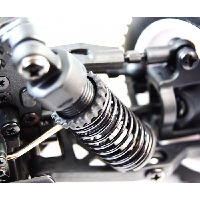 Adjustable oil-filled shocks with adjustable coils, adjustable angle and adjustable droop giving you full setup tuning. Works with the anti-roll bars to give exceptional handling.