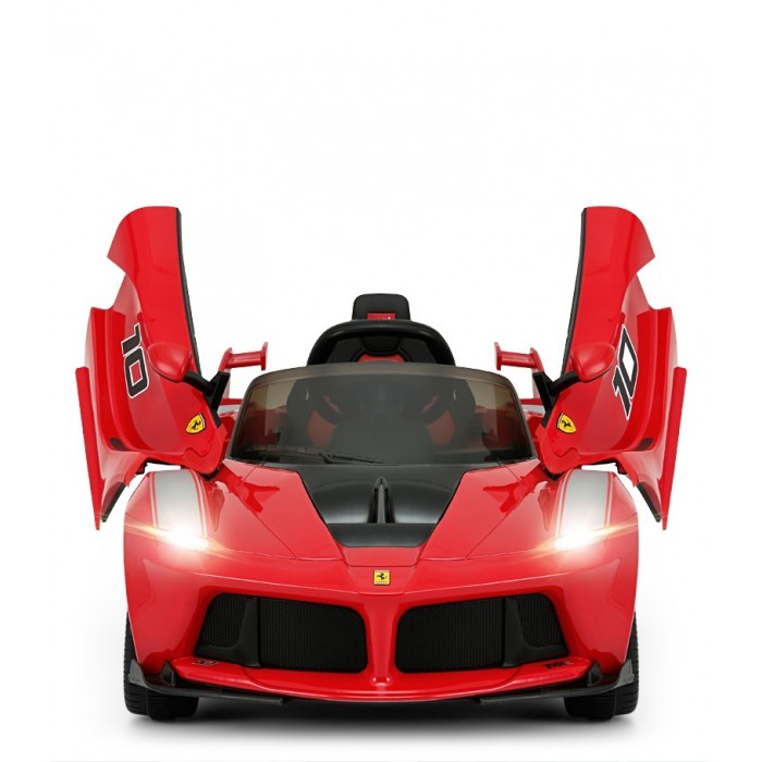 This ride on car is feature packed. The scissor doors are just like the real thing with hydraulics for smooth opening and closing. There is an MP3 music player as well as lots of realistic car noises and a horn. For younger drivers there is a remote controller for the parent so you can control the speed and steering. From inside the car there is a cool lit up one button start with exciting startup sounds when pressed and a gated gear stick for selecting high / low speed or reverse. The instrument panel on the Ferrari is stunning with a bright display. Not only is there LED lights at the front and rear but also working indicator lights. For safety there is a seat belt and soft start system so the speed gradually increases without jolting forward.