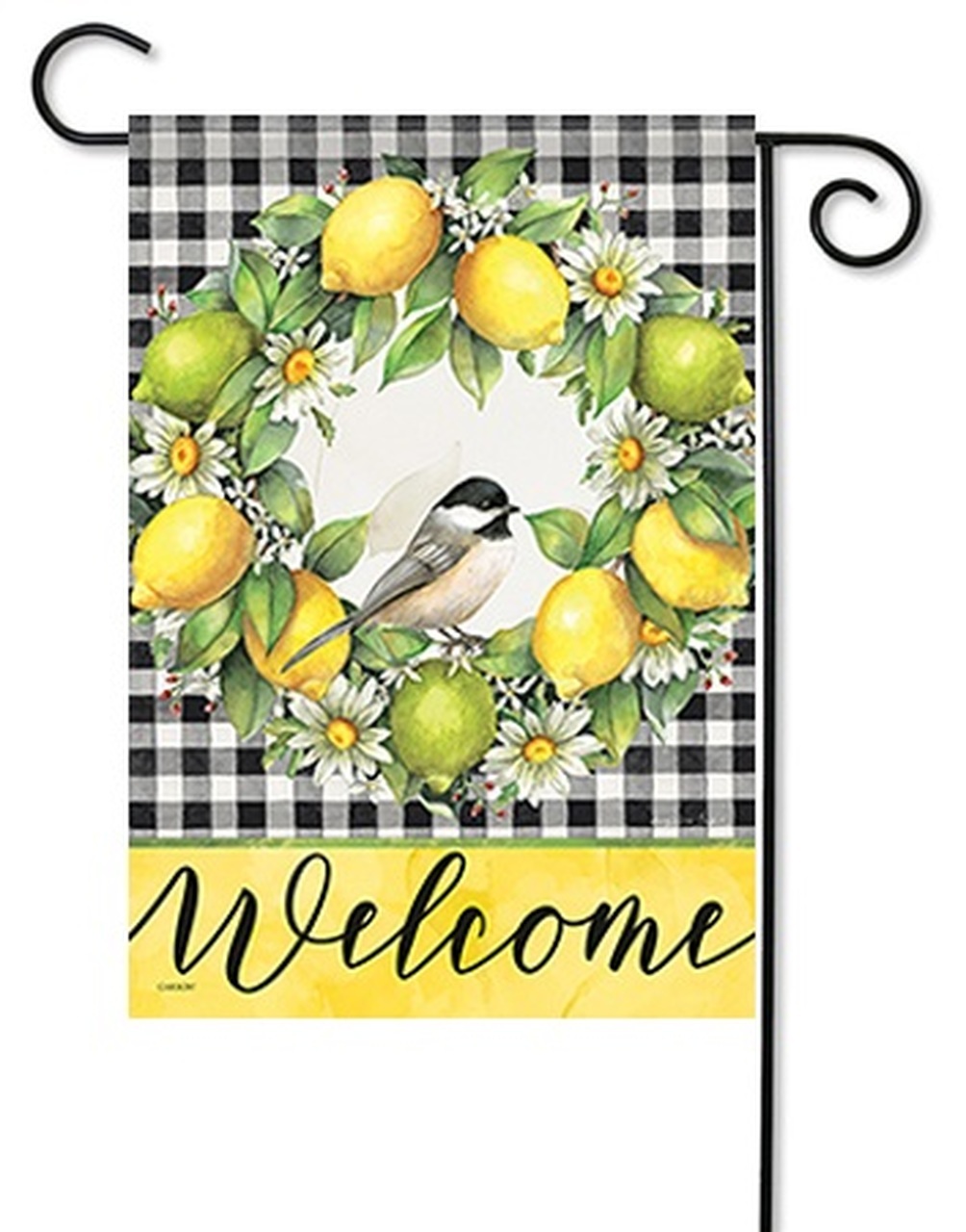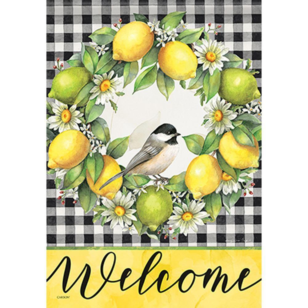 Grove Song Garden Flag measures 12. 5" x 18". Features a lonely chickadee is sitting on a fresh wreath made of lemon and daisies, in front of a black and white checkered background. Caption reads "Welcome" in front of a yellow background near border.Decorative outdoor garden flag features artistic detail with vibrant colors. This unique decorative flag will complement your landscape and yard decor. Ships in 1-2 business days.