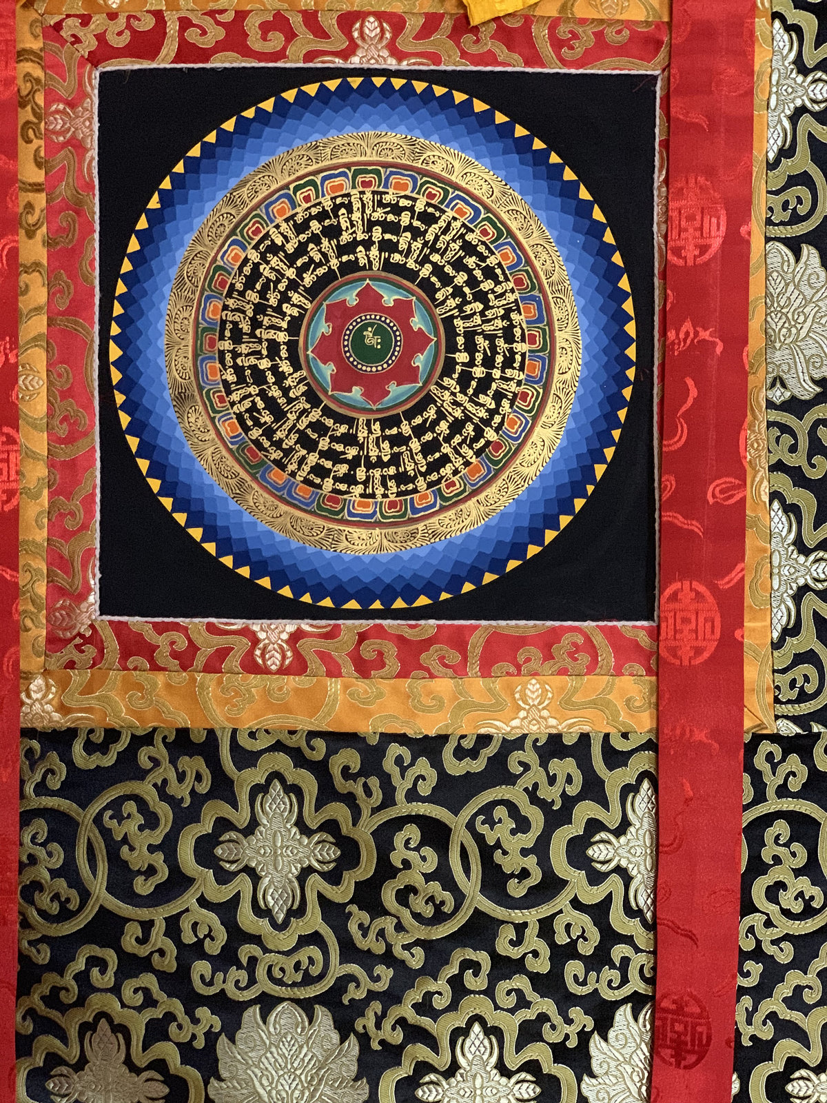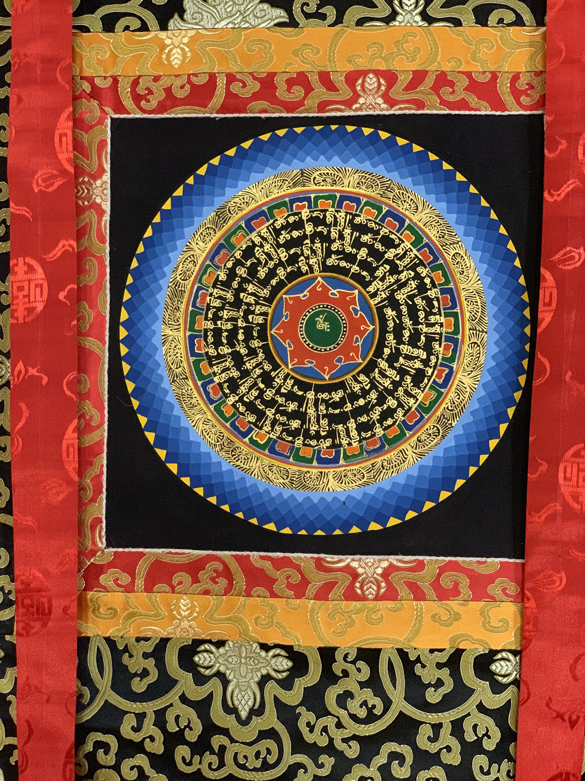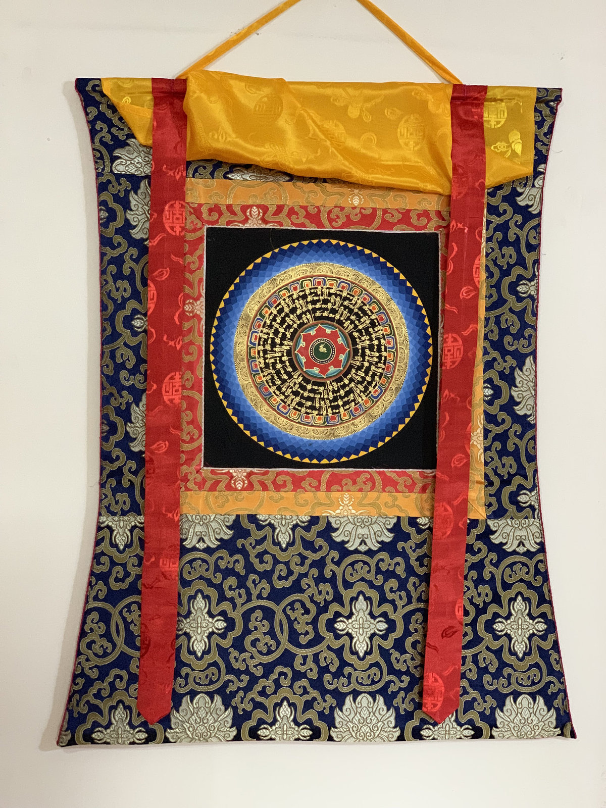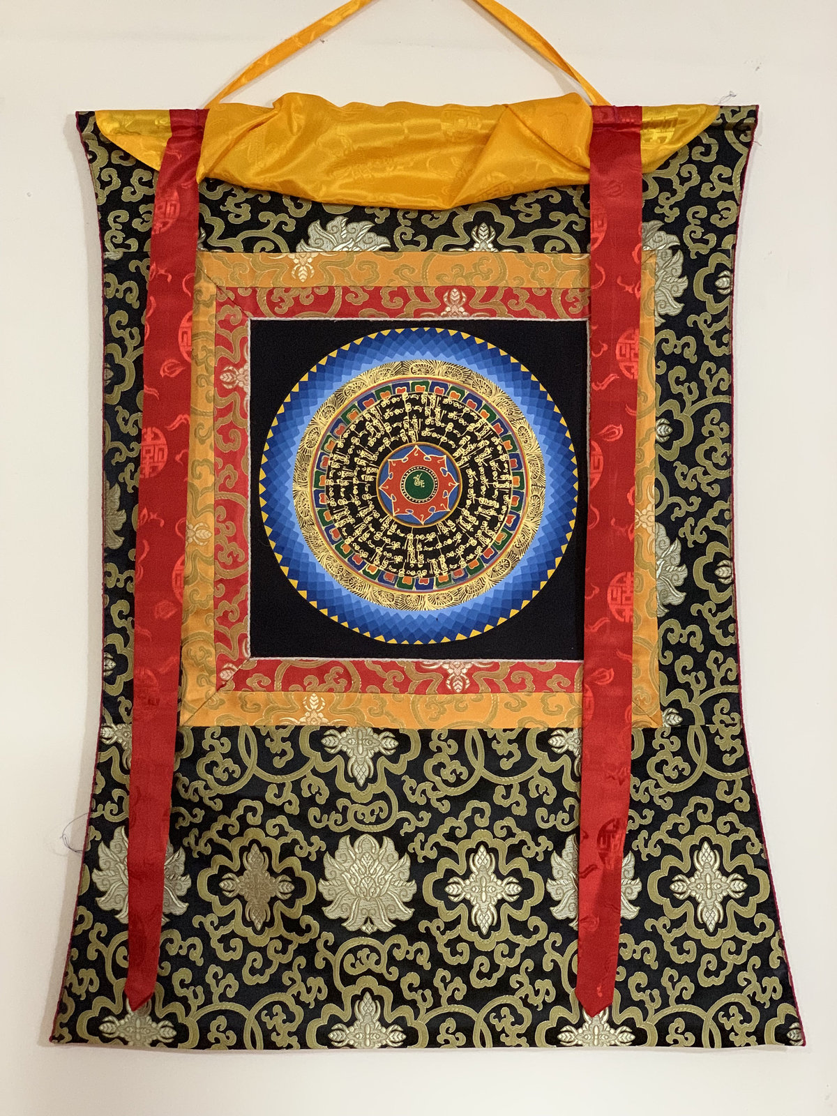 Hand-painted Om Mantra Mandala Thangka Art with Silk Brocade