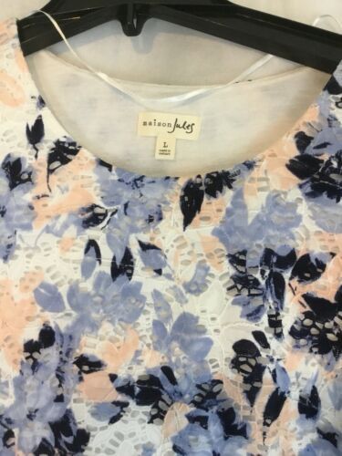 Maison Jules Osaka Floral Spring Summer Dress Eyelet Fabric Soft Lining NWT Lg. Condition is New with tags. Original $69.50. Measurements: length 35”, chest 19.5”