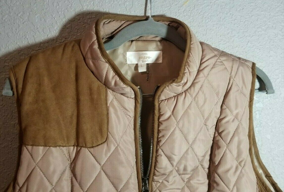 ENTRO Women L Quilted Vest Full Zip Lightweight Zip Pkts Adjustable Strap back. Measurements 19" across and 25" length. Condition is Pre-owned. Shipped with USPS Priority Mail.