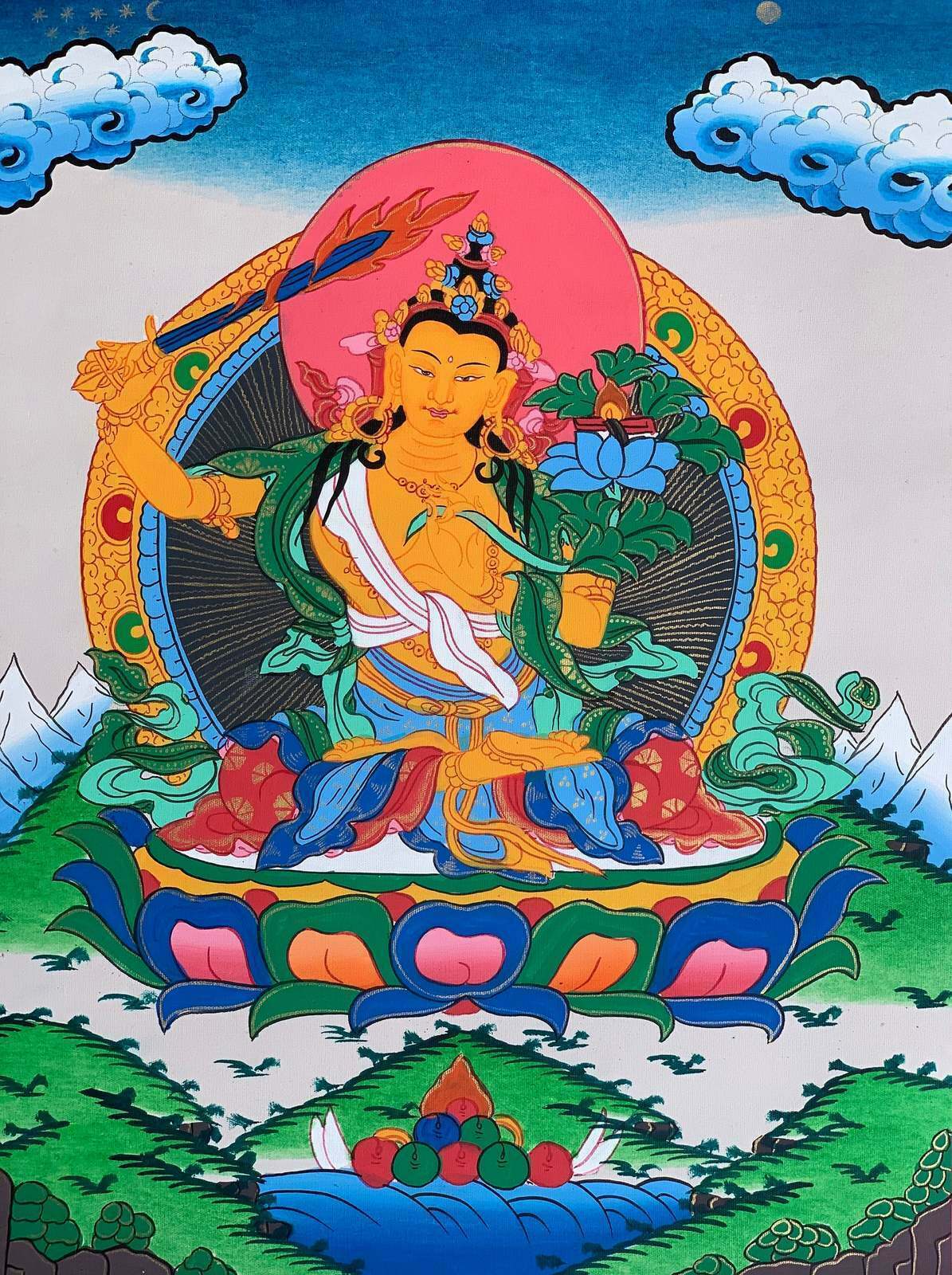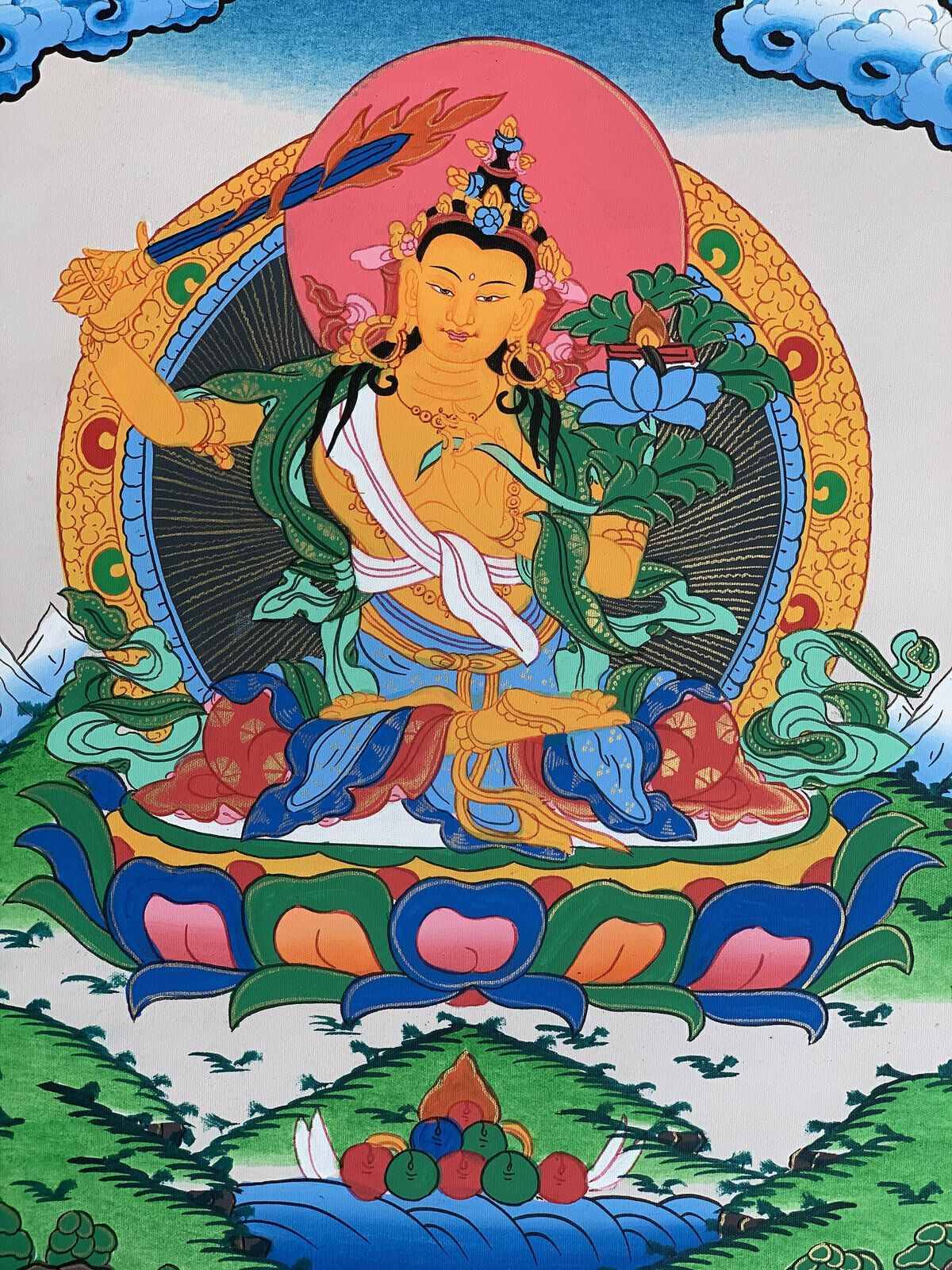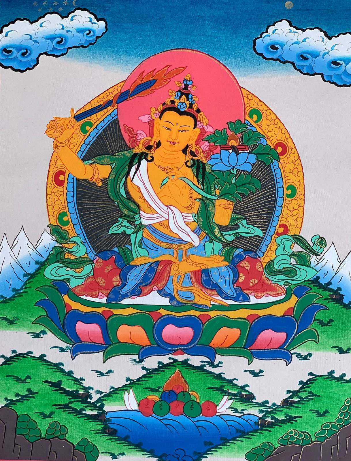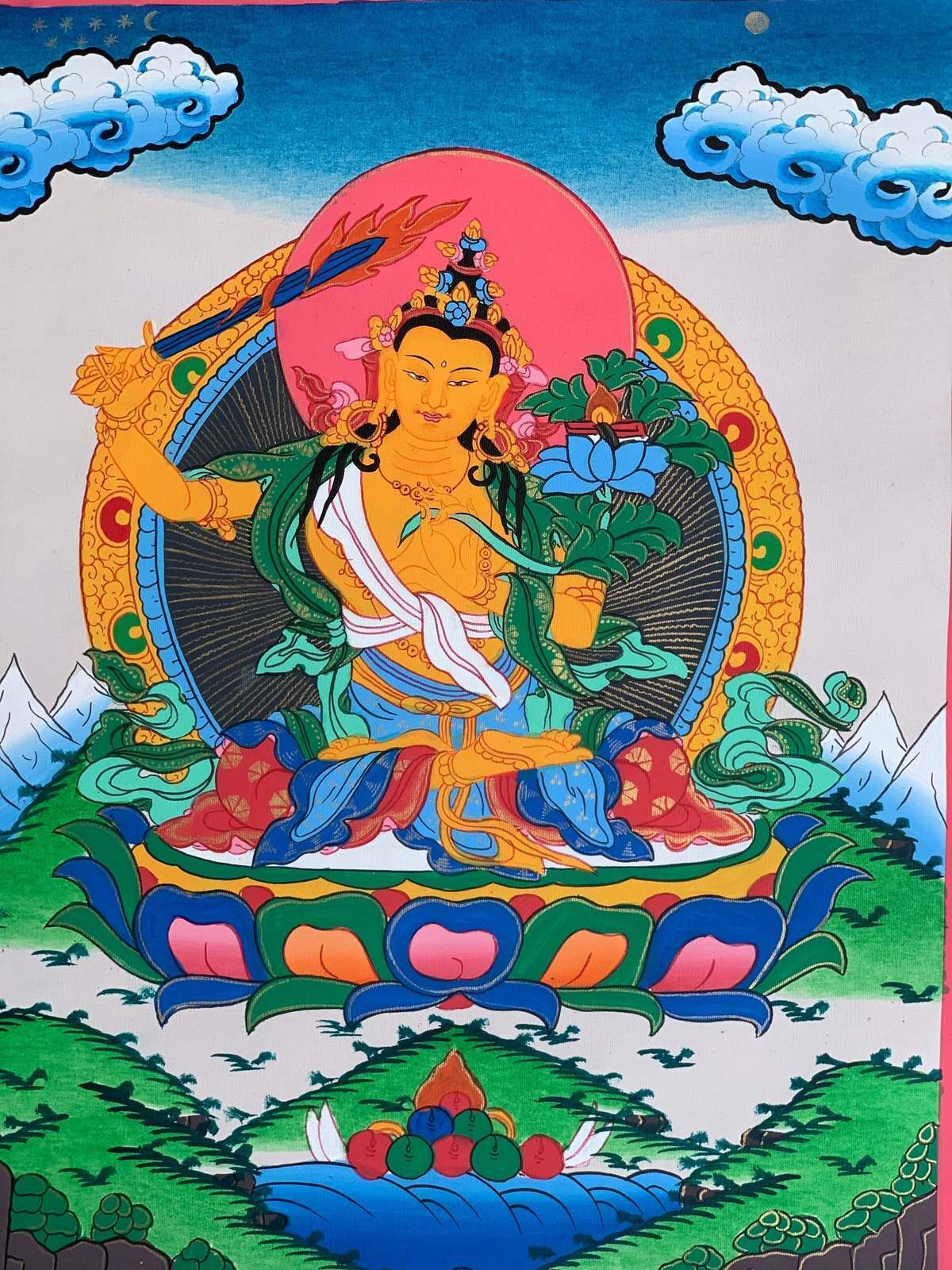 Hand-painted Manjushree God of Wisdom Tibetan Thangka Art on Canvas 12 x 15-Inch