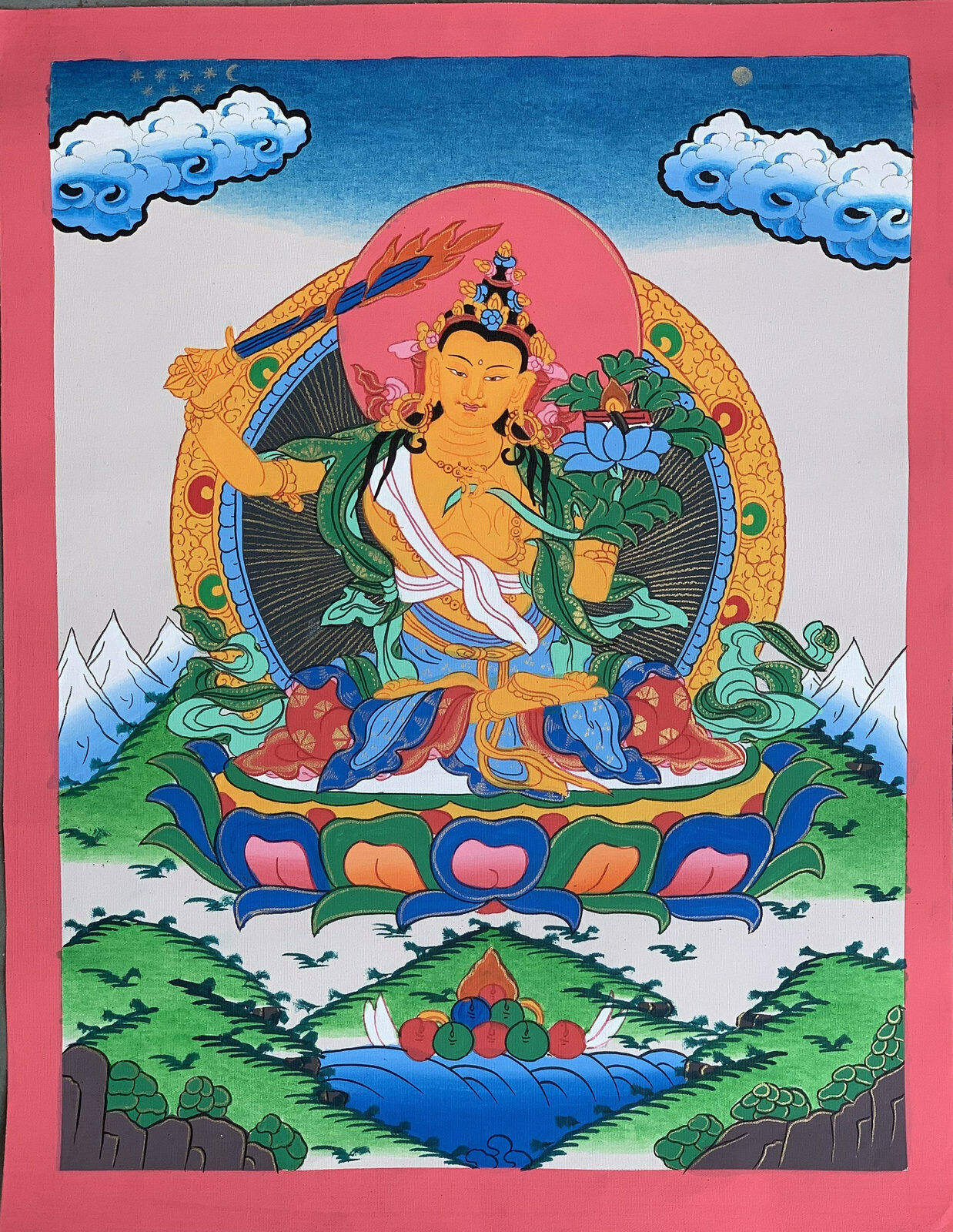 This is original hand painted Buddhist art, Thangka of Manjushree. The Thangka is painted with a gold color in canvas by Buddhist Lama. Manjushri is a Bodhisattva who is considered as a " GOD OF DIVINE WISDOM". It is believed that worshiping Manjusri bring wisdom and intelligence. In Tibetan Buddhism, Manjusri manifests in a number of different Tantric forms. According to Swayambhu Purana, the Kathmandu Valley was once a lake. It is believed that Manjusri saw a lotus flower in the center of the lake and cut a gorge at Chovar to allow the lake to drain. The place where the lotus flower settled became Swayambhunath Stupa and the valley thus became habitable.
