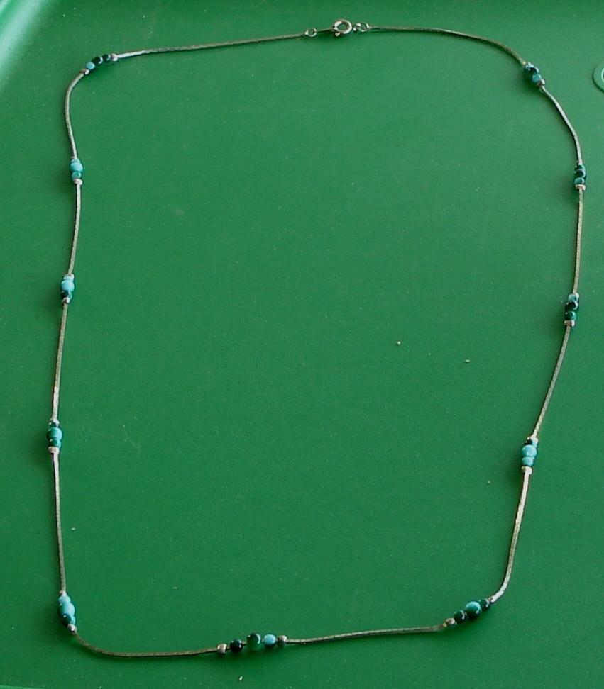 You are bidding on this pretty gold tone chain, with green and dark green beads, which are made of plastic or possibly glass, set around it. The chain and beads are in very good condition, but the chain is a little tarnished. I am unsure of the age or origins of the necklace, or of the actual gold content, if any. There is one little grouping of beads that is a little loose on the chain. The chain is 29.5” long when unfastened. This is a very nice vintage necklace, and is very pretty too.