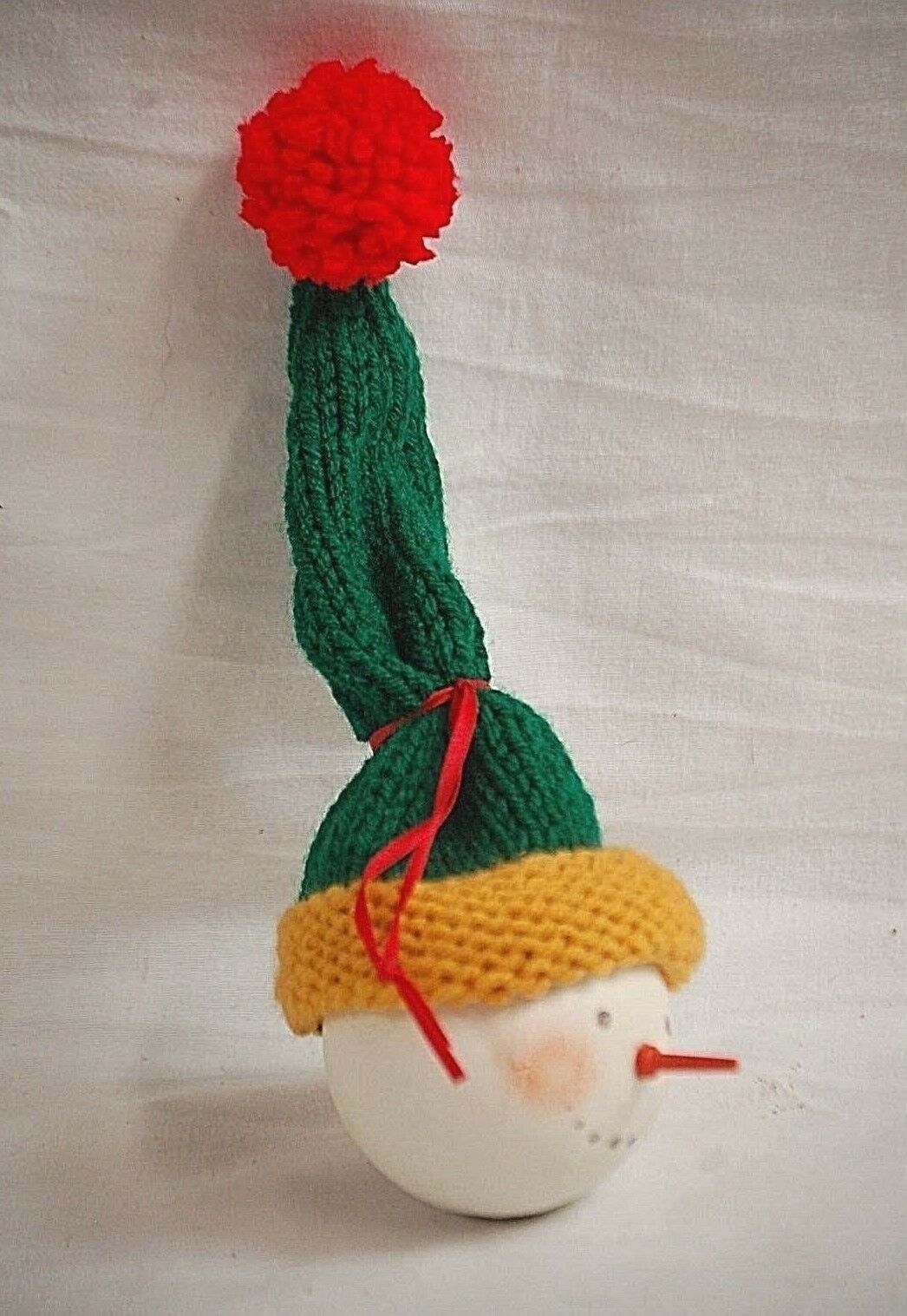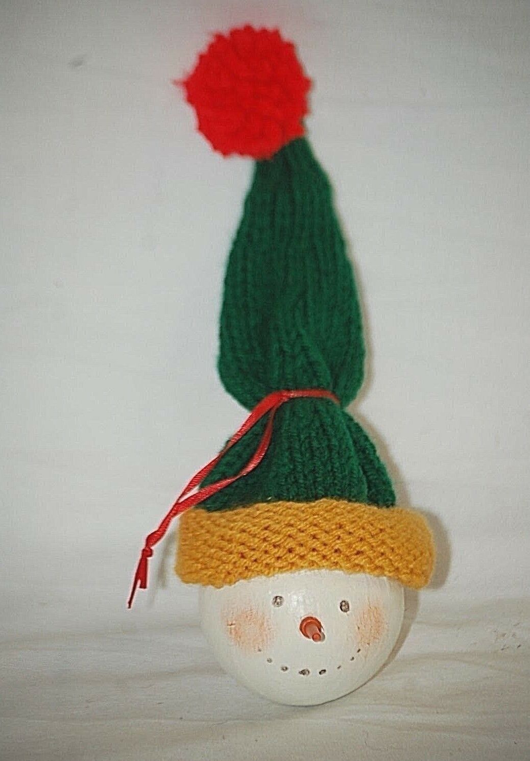 Whimsical Folk Art Snowman Ornament w Knitted Stocking Cap Christmas Xmas Decor.