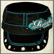 Remetee Military combat fatigue hat features a bright blue constrast stitching all over with Remetee Logo embroidered above the bill. Large metal grommet and studs accents on the front of the bill adds edgy effect. One size fits all. Color: black.