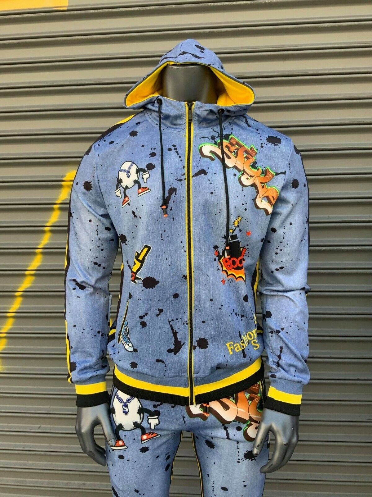 Men's Mid Blue Bleached | Black | Yellow Drawings All Over Fashion Tracksuit added to cart.
