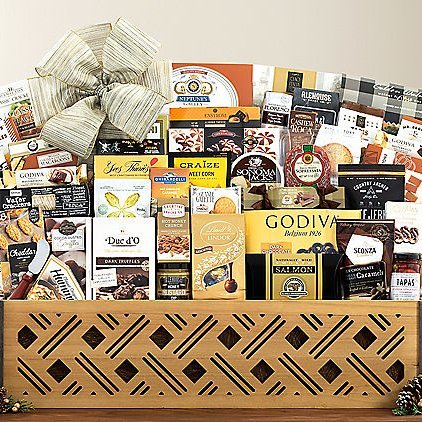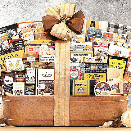 This magnificent gift basket is filled with a distinctive assortment that creates a lasting impression. Godiva dark chocolate pretzels, milk and dark chocolate bars, Lindt milk, white and dark chocolate truffles, crackers, smoked salmon, Daniele salami, vanilla sea salt caramels, mango habanero beef jerky, Ghirardelli milk chocolate with caramel, vanilla fudge, Spanish style tapas, English tea and much more are a sight to behold.