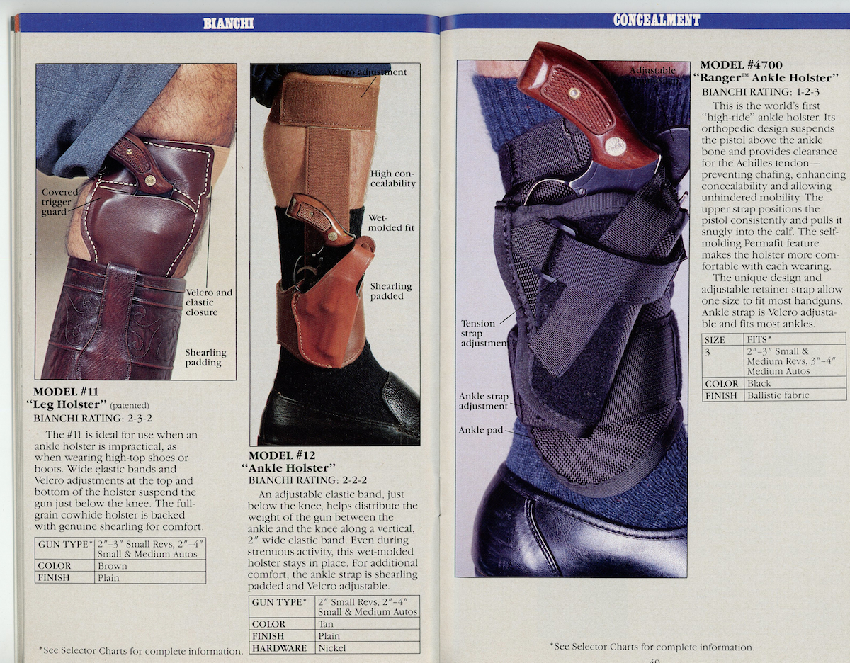 Includes sporting, concealment, police, military, misc. also a chart for selecting the correct holster for your firearm.