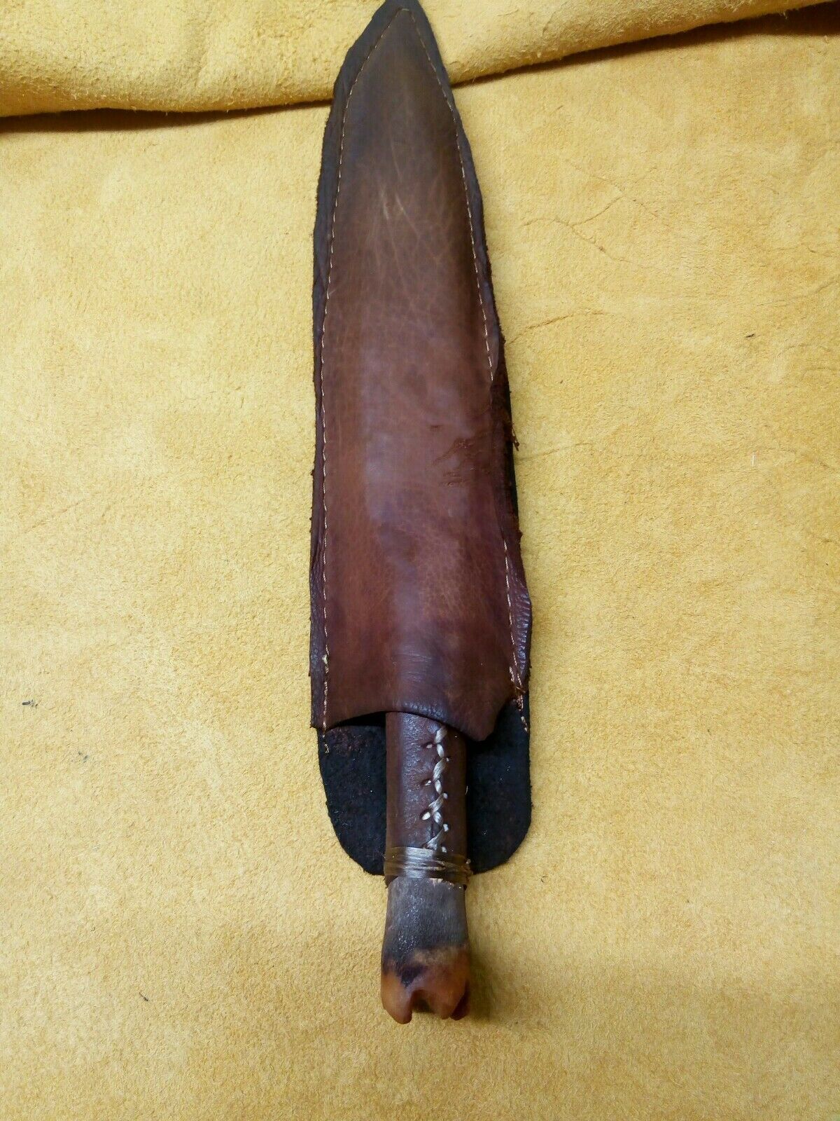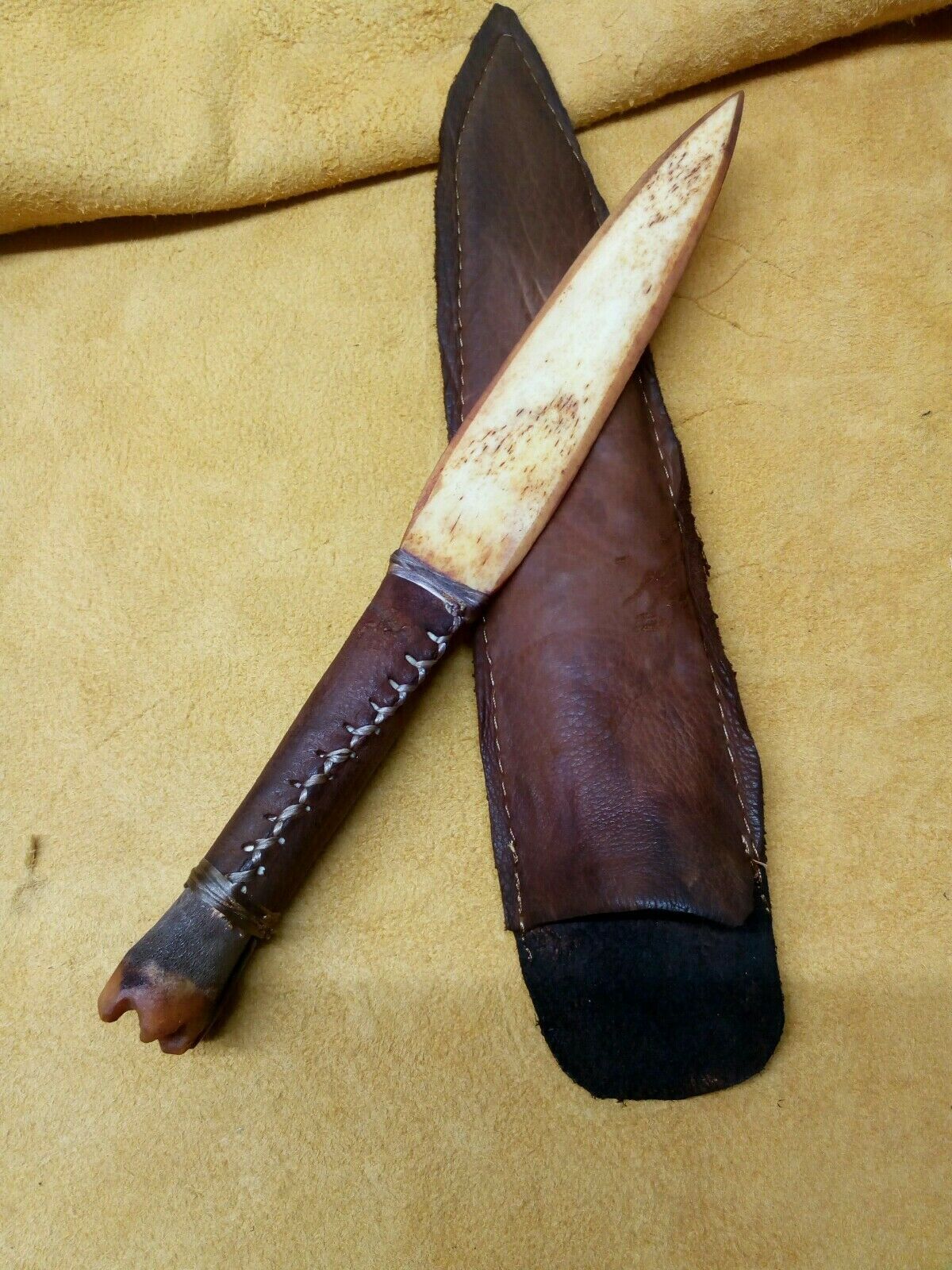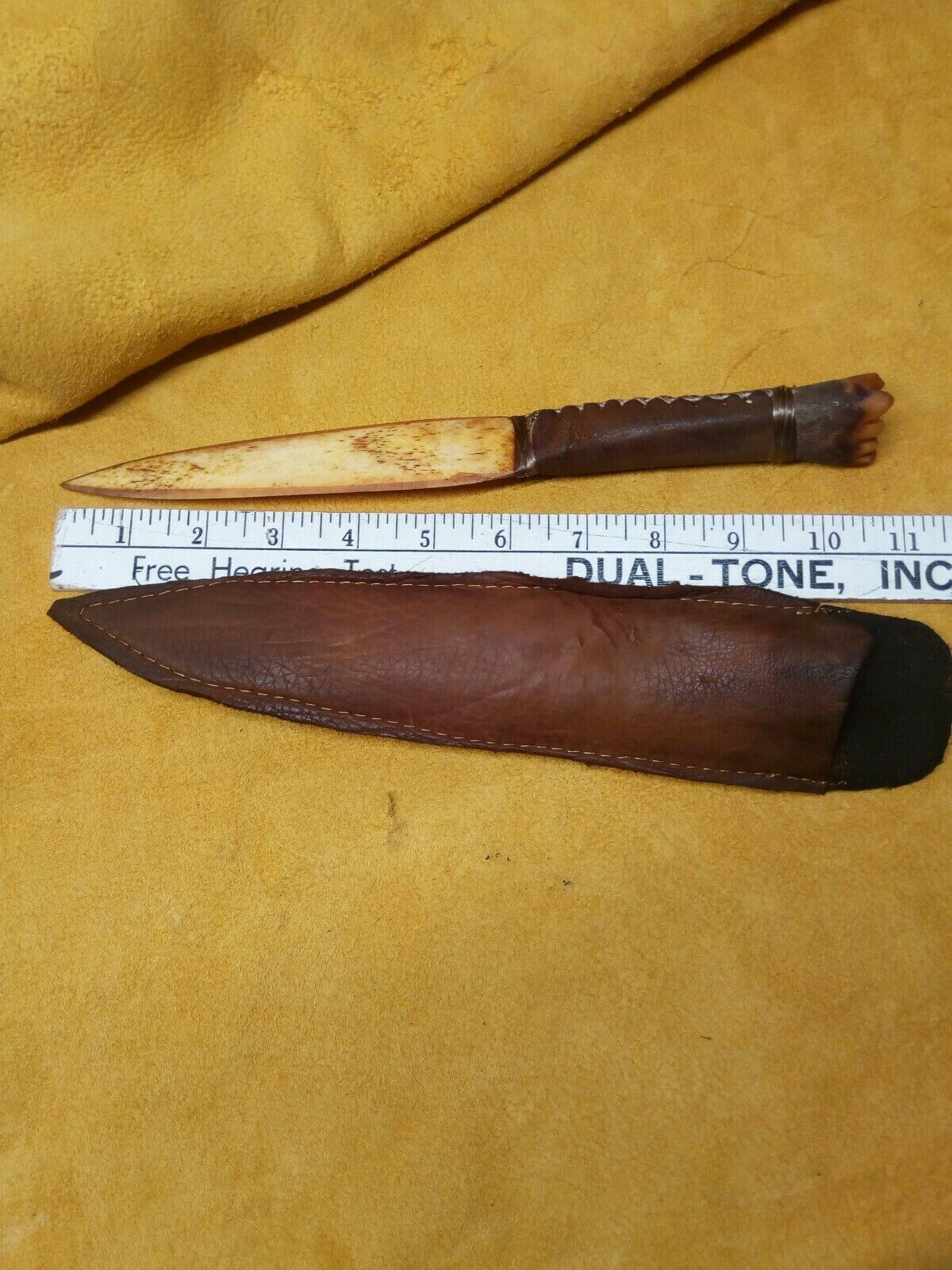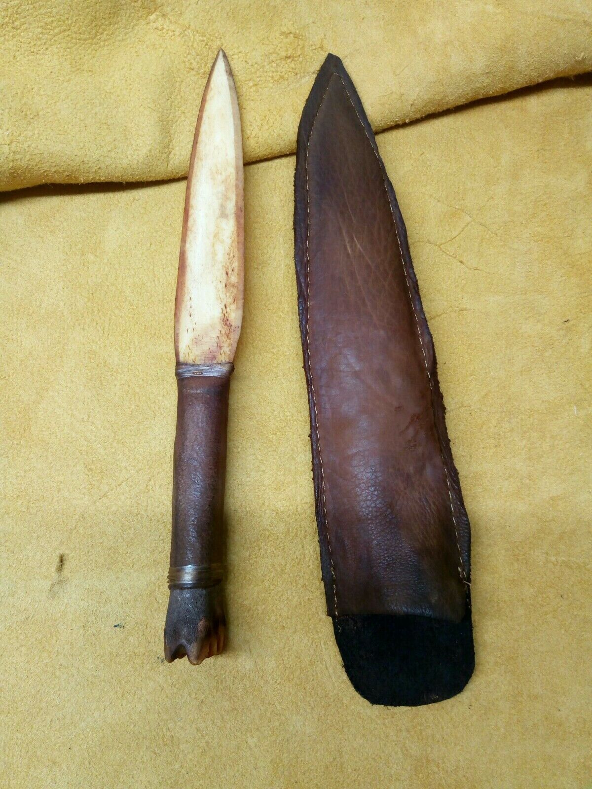 Buffalo Bone knife blade, Deer Leg handle, deer hand stitched buckskin leather wrapped in imitation sinew, Knife. with sheath made of latigo and deer buckskin, machine stitched. 13 inches long. Powwow Reenactment Black Powder. Condition is "New". Shipped with USPS First Class.