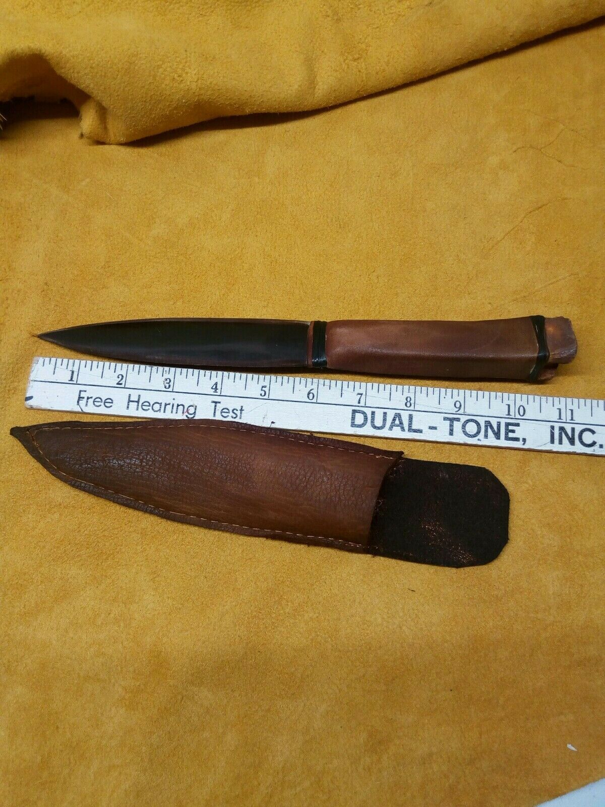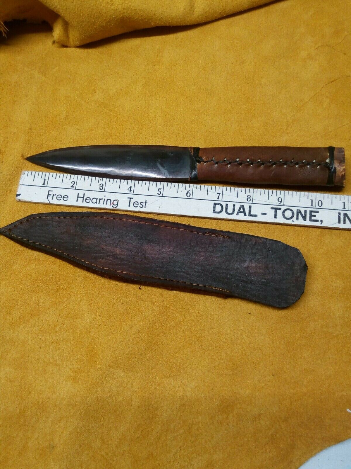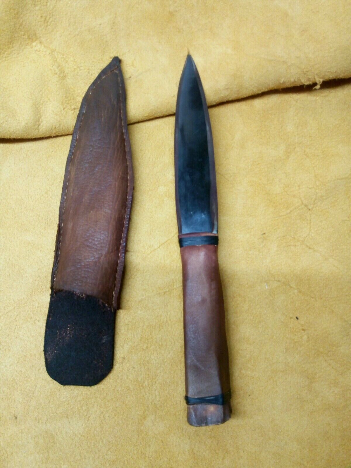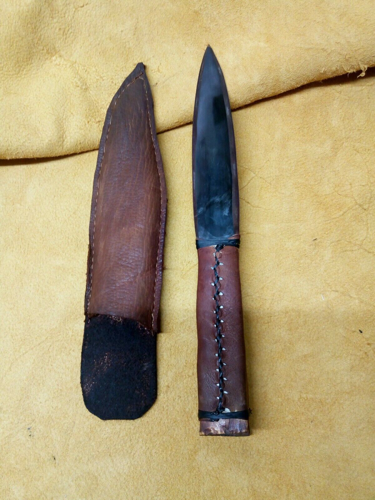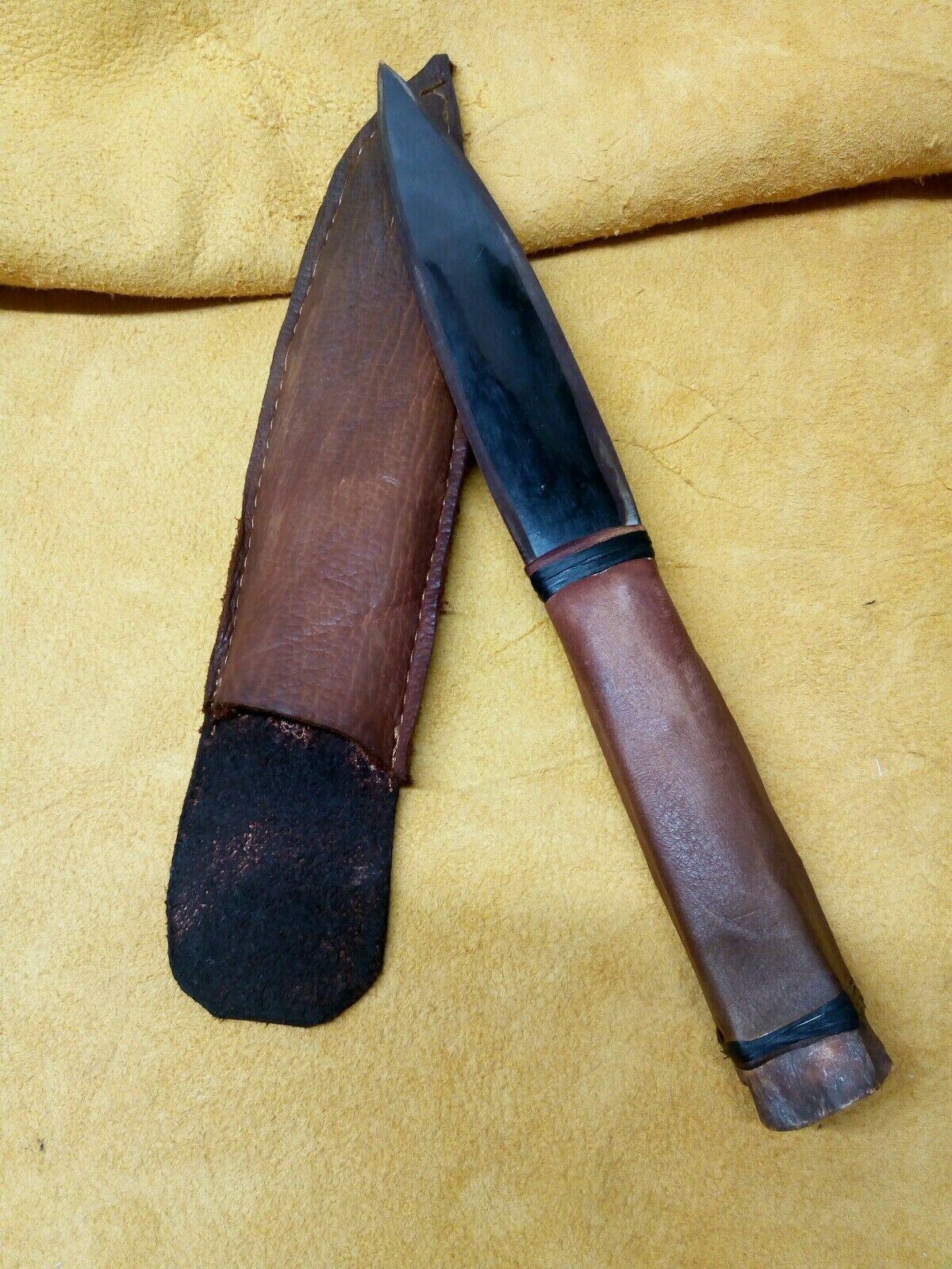 Buffalo Horn blade Deer Leg handle Knife. buffalo horn blade, with deer leg bone wrapped in buckskin hand stitched. wrapped in imitation sinew (black). sheath latigo leather and buckskin machine stitched. 11 inches long Powwow Reenactment Black Powder. Condition is "New". Shipped with USPS First Class