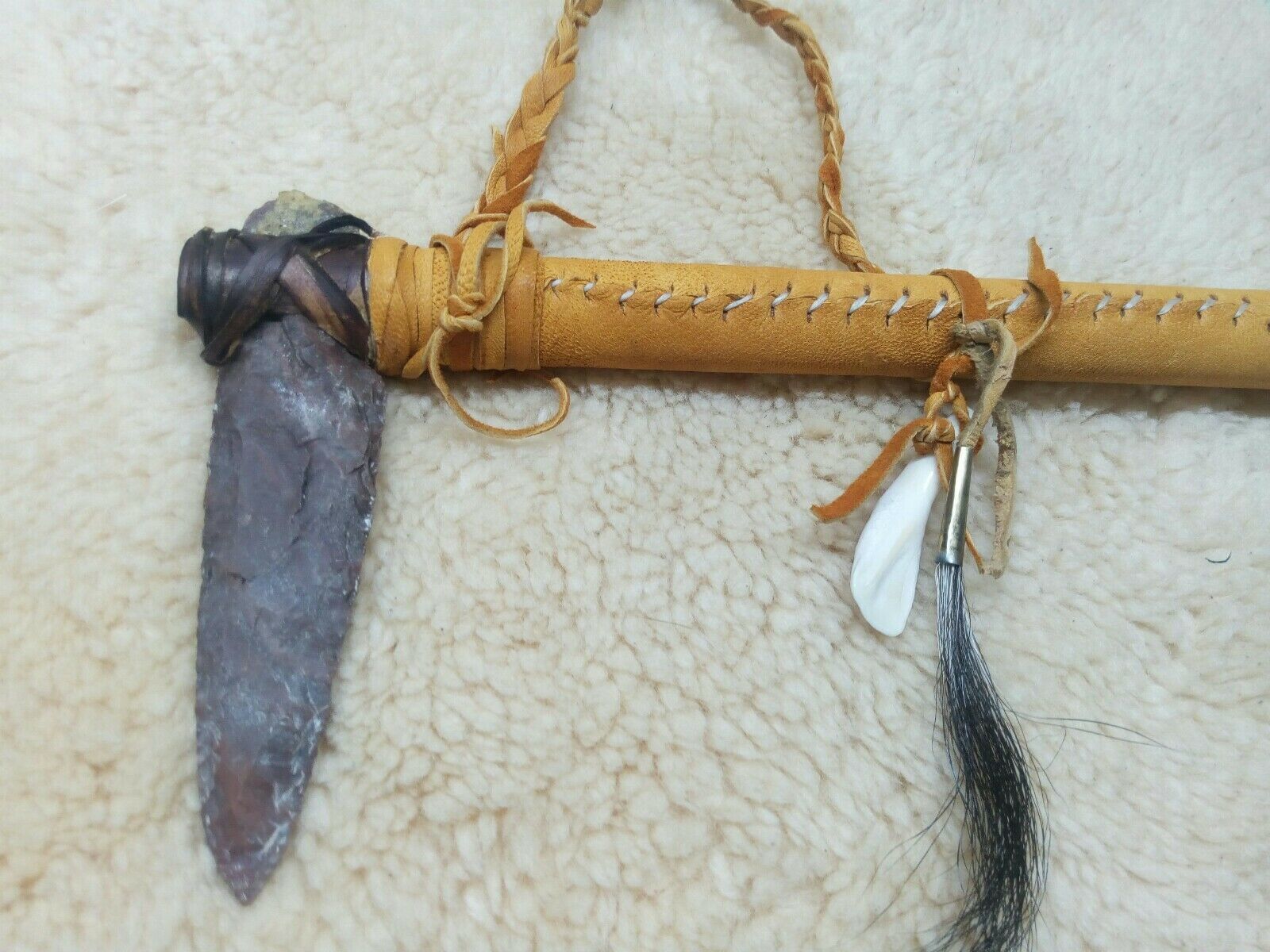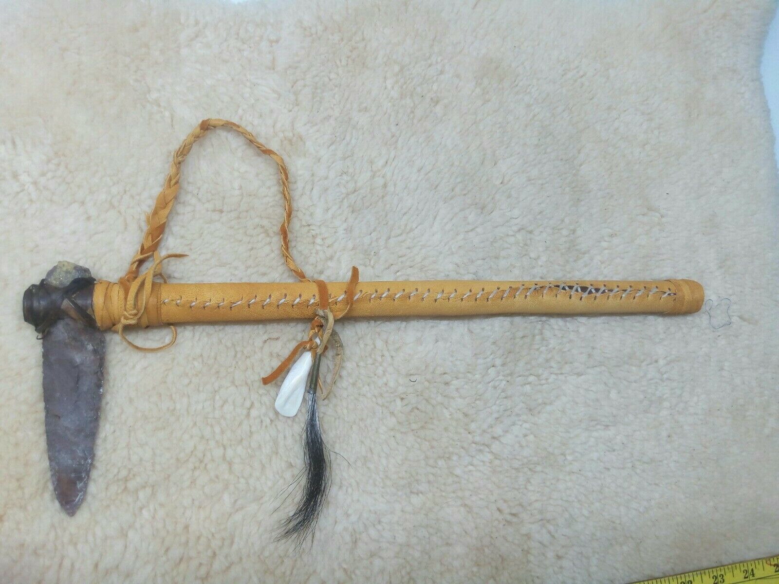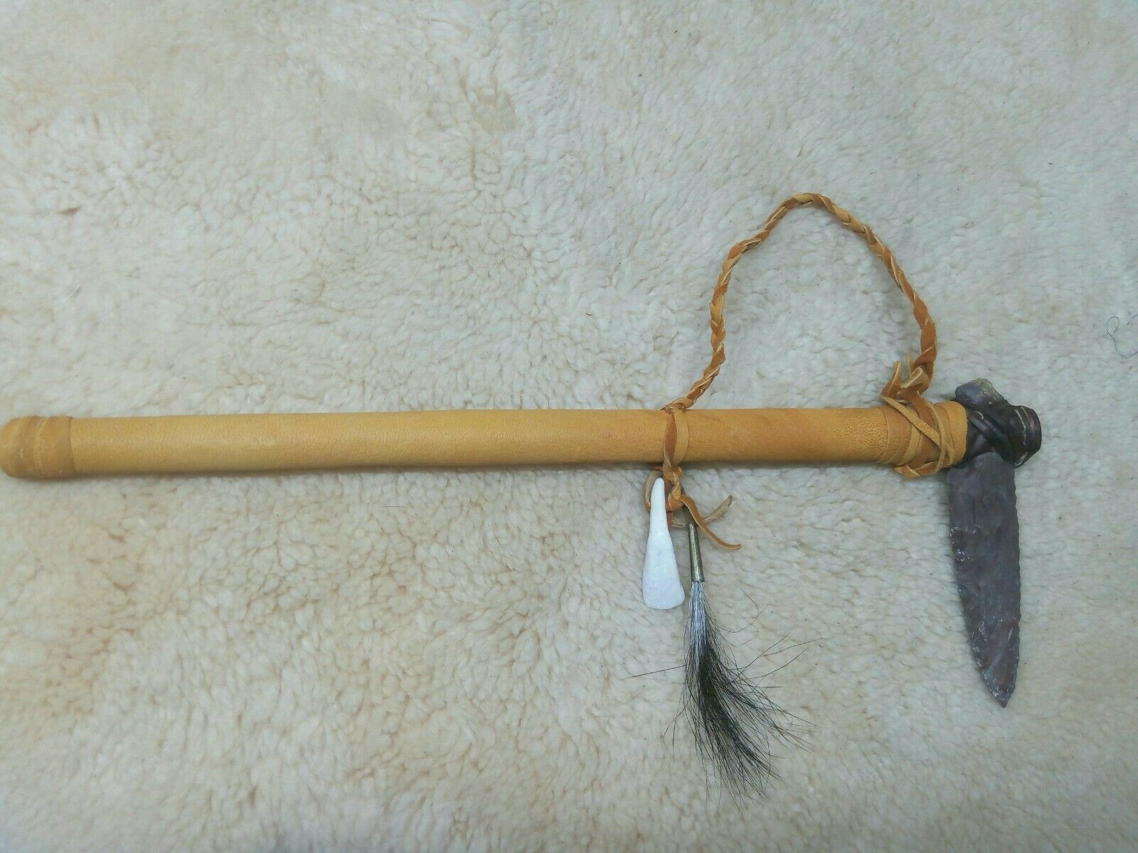 agate stone tomahawk.deer buckskin wrapped, wood hand grip, hand stitched. rawhide wrapped agate stone. decorated with skunk tail and buffalo tooth. braided strap. plains native american style powwow reenactors black powder. Condition is "New". Shipped with USPS Priority Mail.