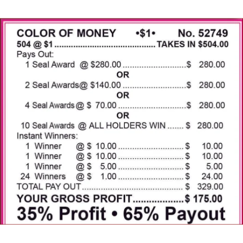 $1 Novelty Pull Tabs - Color of Money/ All Holders Win Seal Game/ $1@504ct