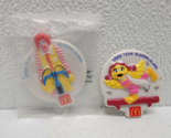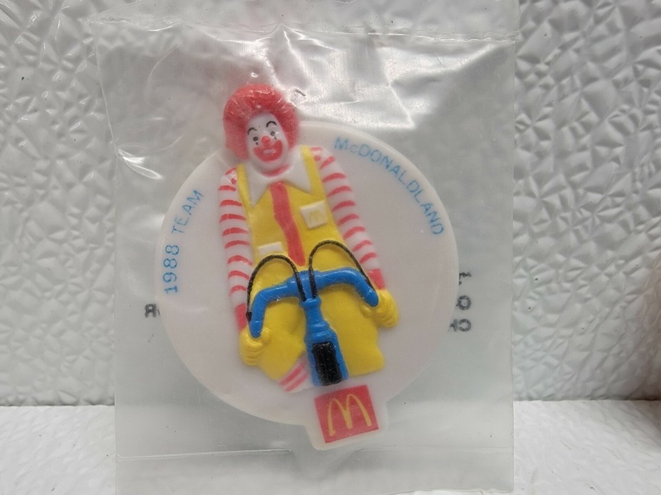 (2) 1988 McDonald's Olympic Team McDonaldland Badge Clips Happy Meal Toys - Ronald McDonald cycling and Birdie balance beam. Ronald is still new in the bag. Images show actual toys that will ship.