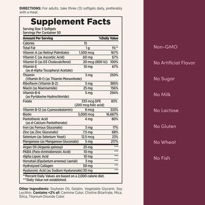 2 Pack Expiration Date of 02/2026+ ? SUPPORTS BEAUTIFUL HAIR; GLOWING SKIN; AND HEALTHY NAILS (1): Hair Skin Nails Rapid Release Softgels contain biotin; vitamins; minerals; antioxidants and other nutrients consistently found in healthy hair; skin and nails ? WITH BEAUTY-SUPPORTING BIOTIN: Nature's Bounty Hair, Skin Nails vitamins contain beauty-supporting biotin; a vital nutrient that helps to maintain healthy hair while supporting overall beauty (1) ? ANTIOIXIDENTS PLUS HYALURONIC ACID: Skin and Hair Nutrients Antioxidants A; C and E Plus Hyaluronic Acid; Laboratory tested and contains no artificial color or flavor; and are free from sugar; milk; lactose, soy; gluten; wheat; yeast; and fish; Sodium free ? HELPS MAINTAINS HEALTHY SKIN: Vitamin E contributes to skin health (1) and Vitamin C is involved in collagen production and formation; which forms the basis for vibrant skin(1) ? FROM THE TRUSTED WELLNESS EXPERTS: Nature?s Bounty Extra Strength Hair Skin and Nails Vitamins are a product of 50 years of dedication to quality and scientific research to make vitamins and nutritional supplements of unrivaled excellence