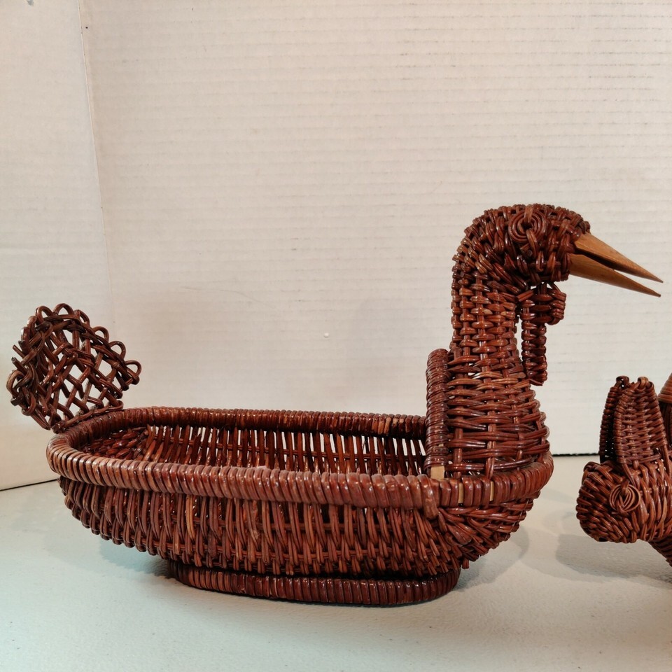 - (2) VTG Rattan Wicker Woven Duck Turkey Goose Basket Wooden Beak & Small Rabbit