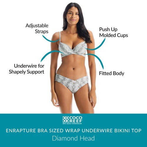 Enrapture Underwire Bra Sized Bikini Top Molded Cups, Wrap Style in cup sizes C, D, DD, E, and F. The Coco Reef Enrapture Bra-Sized Bikini Top will enhance your curves with its feminine wrap design and animal prints. The molded cups and underwire offer perfect support for larger cup sizes, while the hook and eye back closure offers bra-like support. The more support, the more confident youll feel and the hotter youll look. With the LYCRA XTRA LIFE material, the Coco Reef swimsuits are chlorine resistant, colorfast, and keep their brand new look for longer. Product Details: Bra Sized Wrap Bikini Top; Molded Cups and Underwire for Shapely Support Comfort; Adjustable Straps for a Customized Fit; Back Hook and Eye Closure with Slide Conceal Cover; Available in Larger Cup Sizes C, D, DD, E and F; Hand Wash Cold, Line Dry; Swimsuit Fabric: 85% Nylon/15% LYCRA XTRA LIFE.