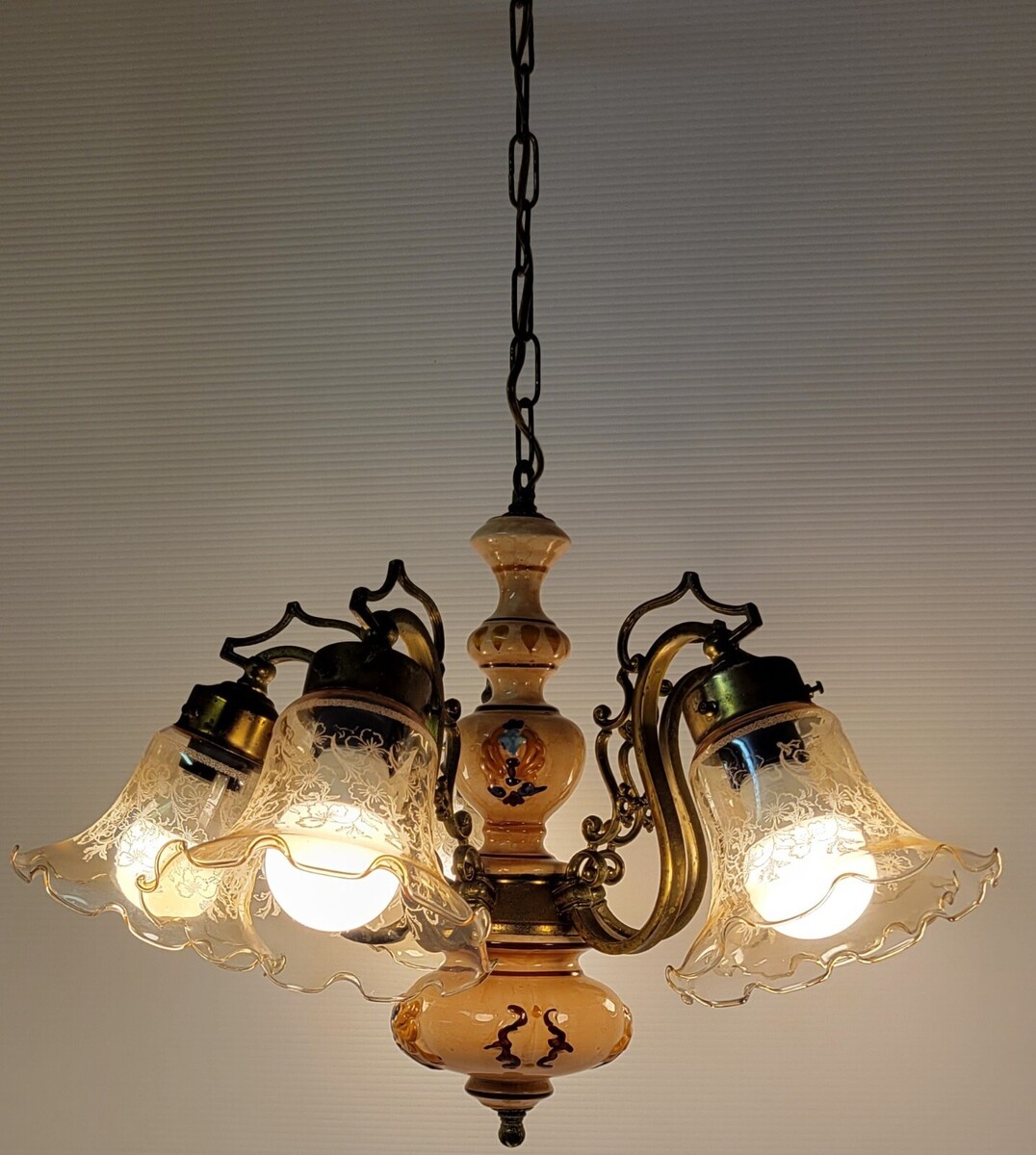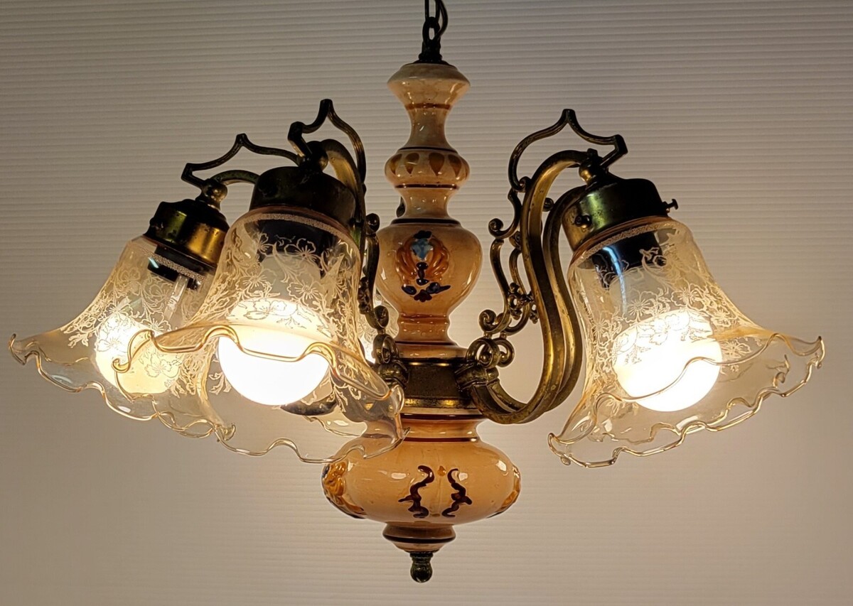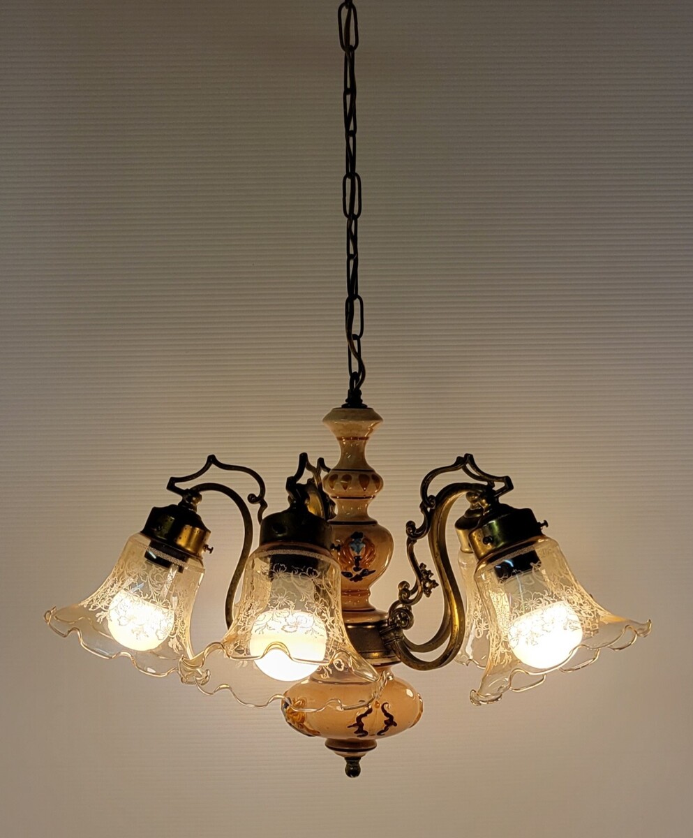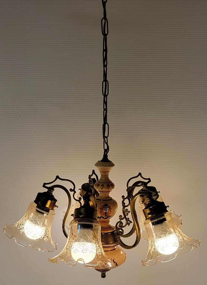 - *B) Vintage 5 Arm Porcelain Floral Glass Shade Hanging Light Chandelier