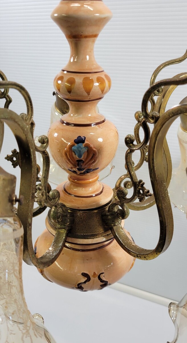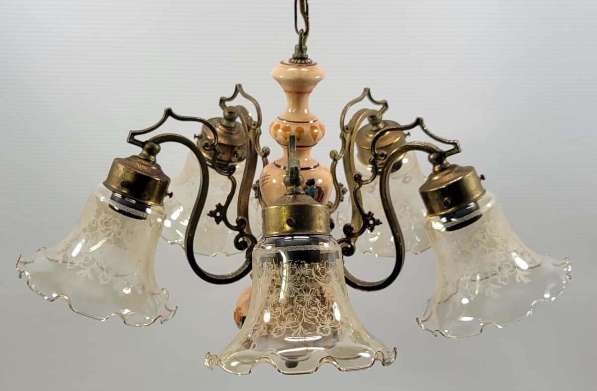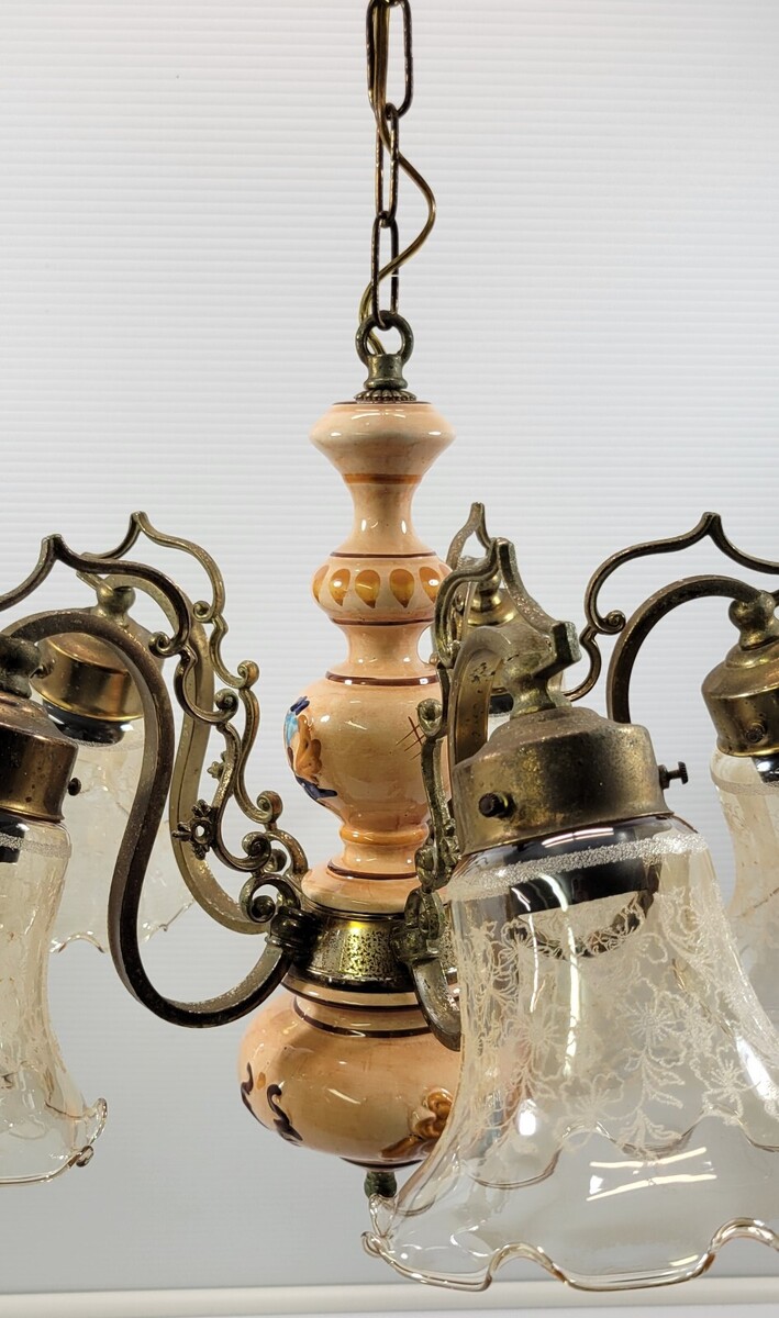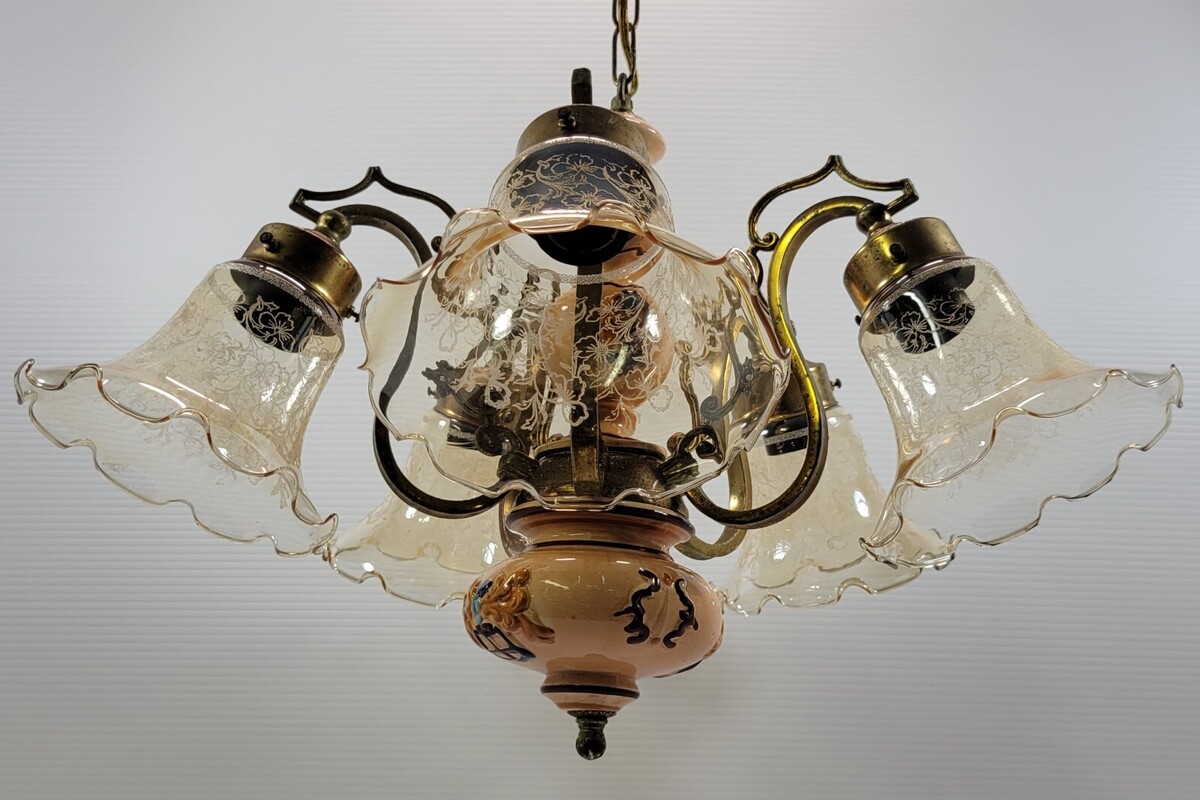 *B) Vintage 5 Arm Porcelain Floral Glass Shade Hanging Light Chandelier