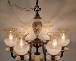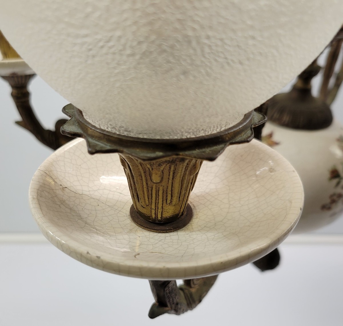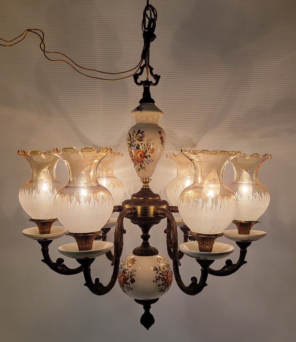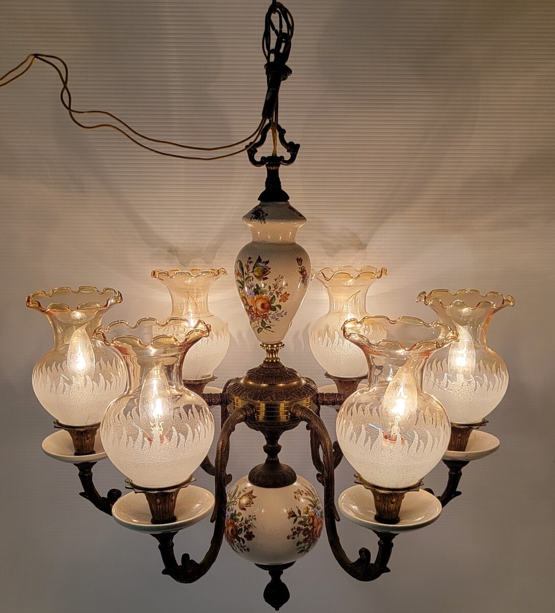*B) Vintage 6 Arm Porcelain Floral Glass Shade Hanging Light Chandelier
