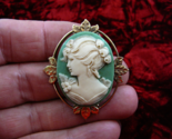 (Internal #CM44-20) Excellent, new, antique-stained resin, hand-molded (-duced from the original shell cameo) cameo brooch in an OFF-WHITE color with GREEN background color, mounted on - - brass; cameo pin/pendant is 2" long x 1-5/8" wide, clasp pin/pendant glued on back horizontally.