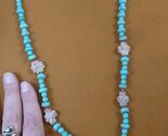 This is a 24" long necklace with Fairy crosses 3/4" on bottom, others 5/8", 6 mm round turquoise beads; 9x5 mm donut shaped turquoise beads; sterling silver plated lobster claw tab closure.