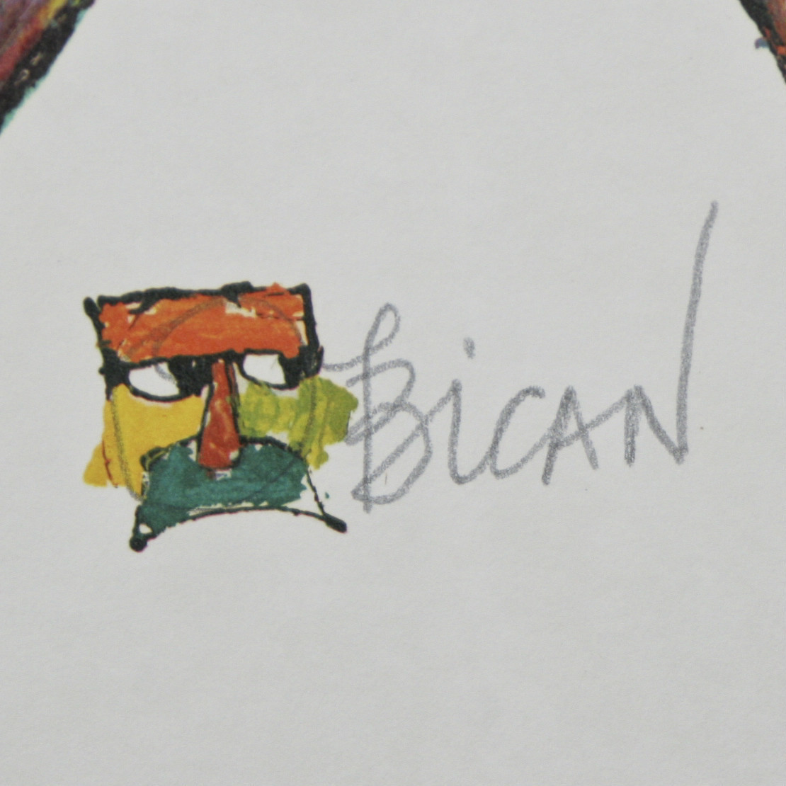 Jovan Obican (1918-1986) was born in Cannes, France, of Yugoslavian parents. From childhood on, Jovan practically devoted himself to art, scratching designs on mud pies when paper was unavailable. He trained with many recognized teachers with many styles. Obican is identified with his style the world over, a style that is simple yet sophisticated; child-like yet masterfully adult; a style that tells a story with psychological, philosophical or sociological overtones. His funny little people are always colorful, full of spirit, living with music and birds to bring them happiness. Obican was a prolific artist, constantly experimenting in various medias, achieving masterful results. (Source:RoGallery)