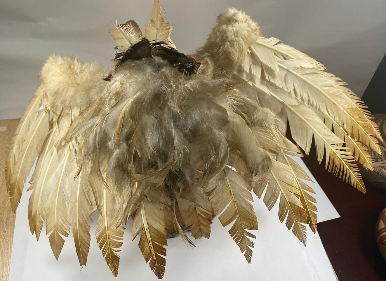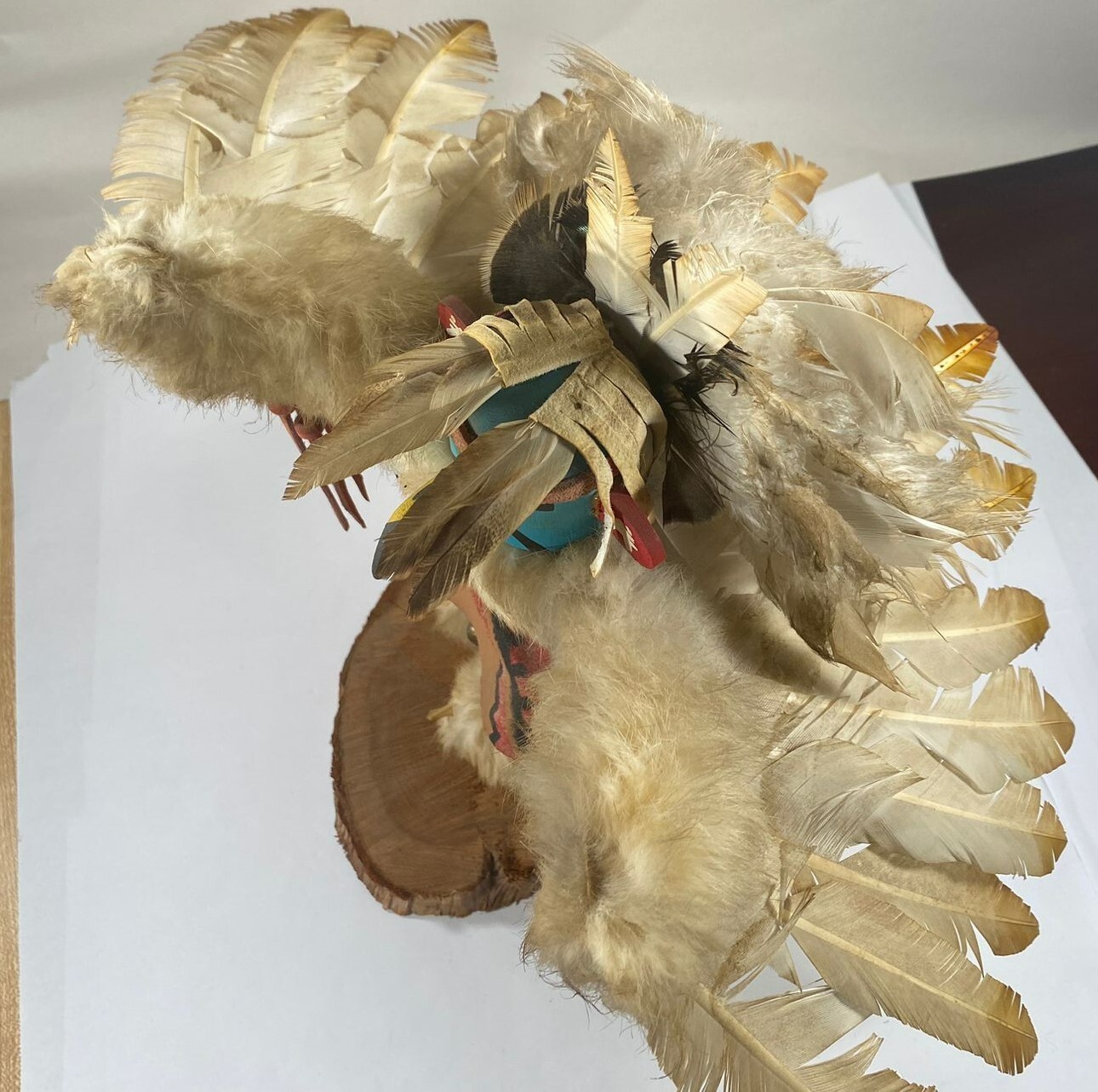 Kachina is in decent vintage condition. Moderate to severe shelf wear; lots of dust and grime. One or two slightly loose feathers. See photos for details.