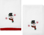 The Avanti Winter Snowman White Embroidered Decorative Fingertip Towel 2-Pack features a happy, smiling snowman with top hat green and white scarf. Red snowflakes finish the winter scene. Set includes two 11" x 18" 100% cotton white velour towels with red polyester border.