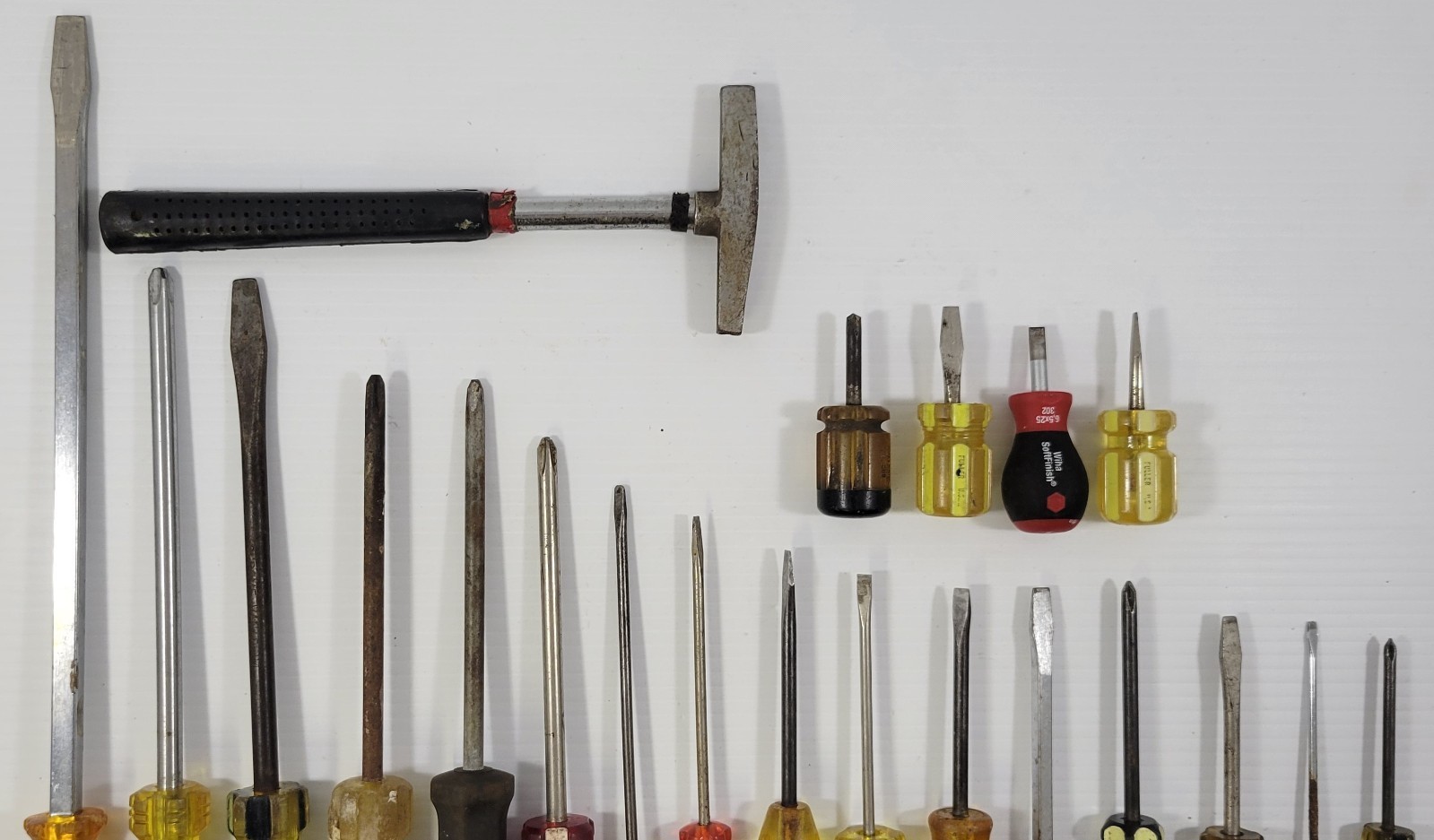 - *J2) Vintage Mixed Lot of 21 Tools Screwdrivers Upholsterer Hammer