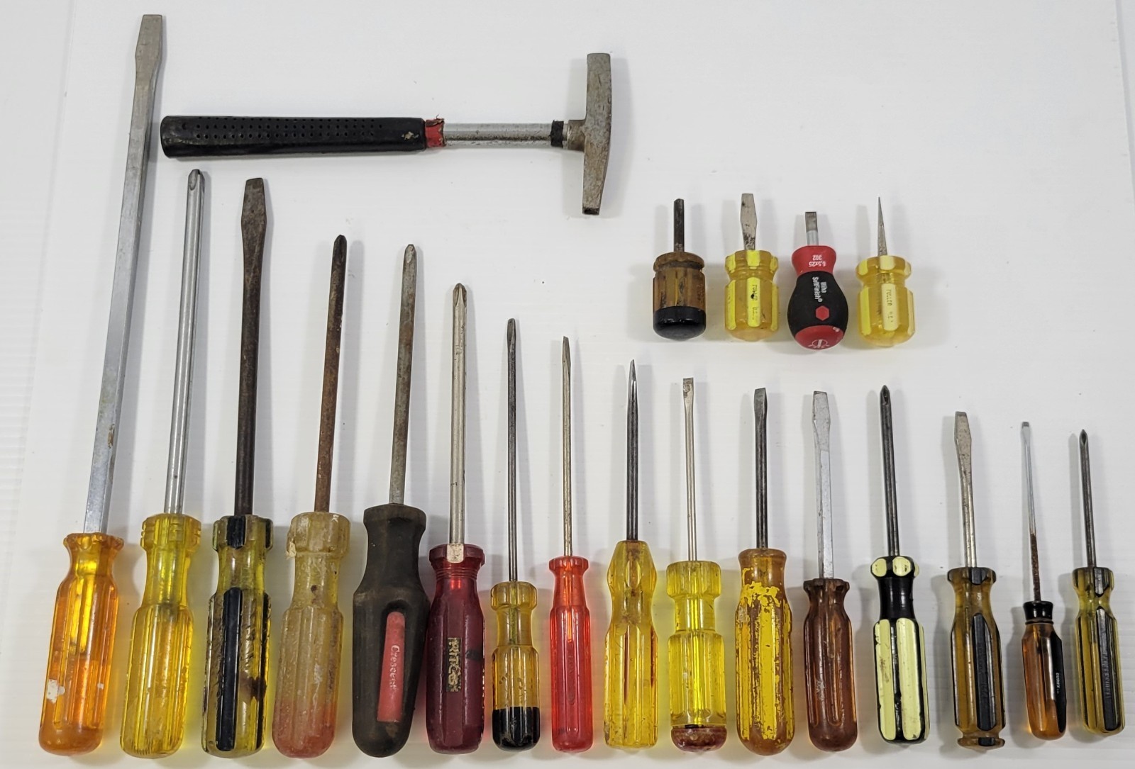 *J2) Vintage Mixed Lot of 21 Tools Screwdrivers Upholsterer Hammer