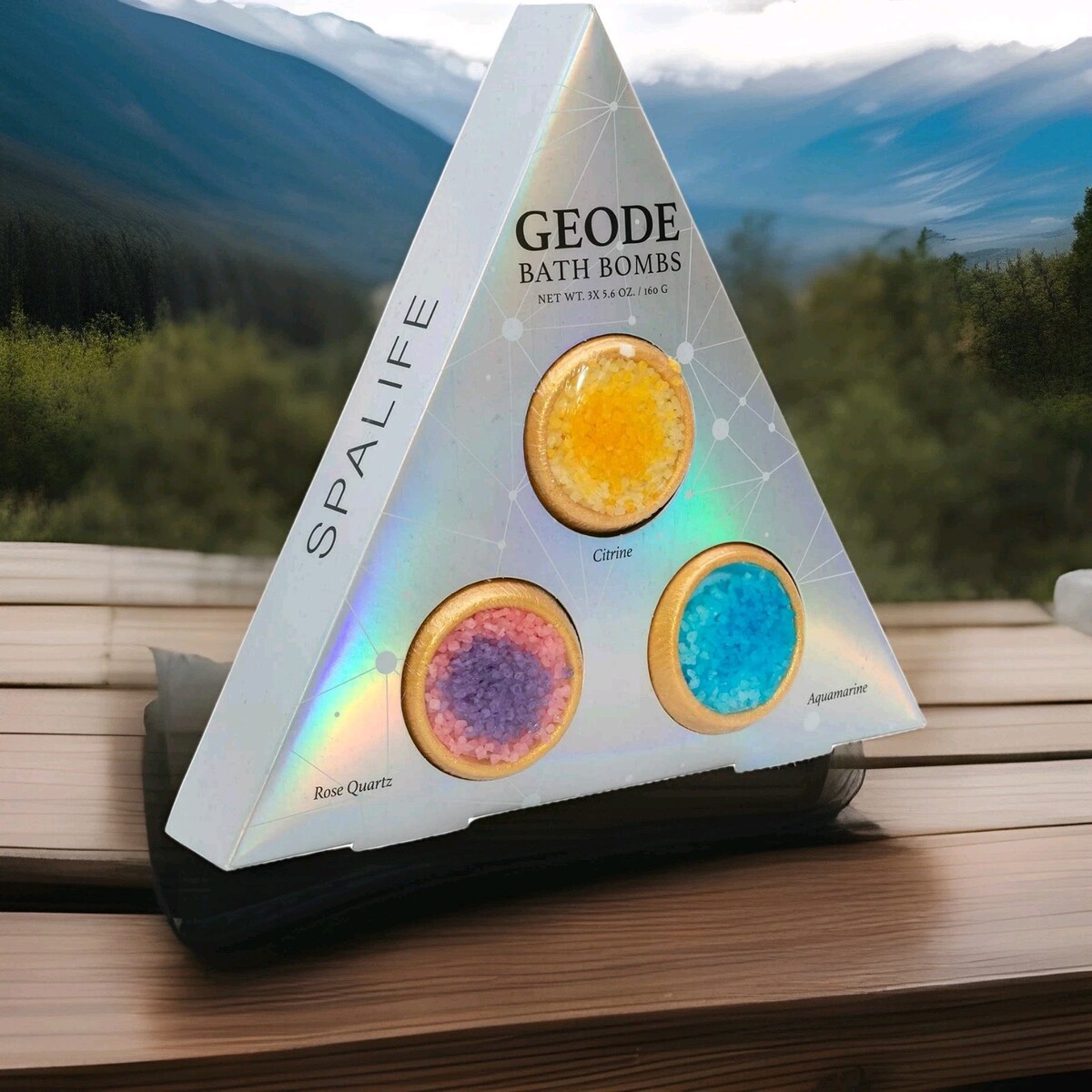 - ( LOT 2 ) SpaLife Geode Bath Bomb 3pc Set Citrine, Rose Quartz & Aquamarine NEW