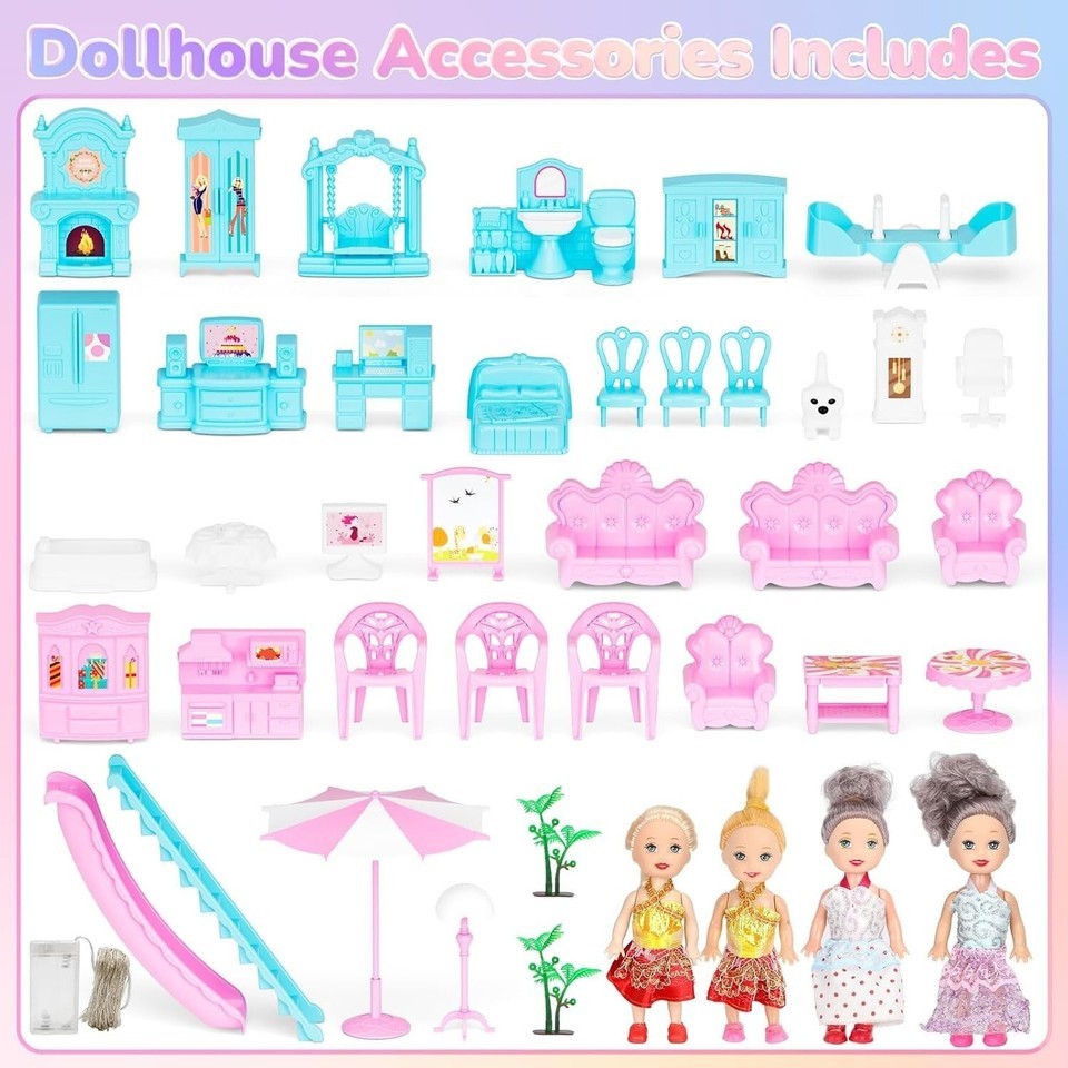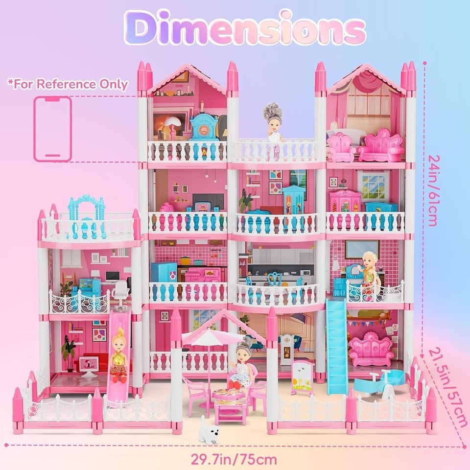 Big Doll house with 39+ Accessories - Each room in the princess castle dollhouse has unique home furnishings, household appliances, slides and other accessories that are easy to move and arrange as you like. The open-sided design for your kids to viewing dolls from a different point of view, which adds to the richness of the dollhouses.