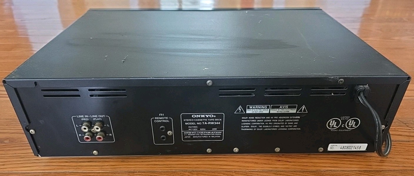 The Onkyo Dual Cassette Deck Dolby with Auto Reverse High Speed Dubbing is a reliable and high-quality audio component that allows you to play and record cassette tapes with ease. Featuring a sleek black design and a variety of features such as infrared connectivity, headphone jack, and stereo L/R RCA audio outputs, this model (TA-RW344) offers a convenient and versatile experience for any home audio setup. With the added bonus of high-speed dubbing and auto-reverse capabilities, this cassette deck is a must-have for audiophiles looking to enhance their collection of home audio equipment.