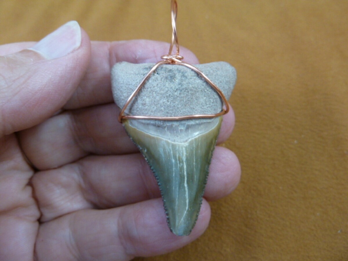 - (S243-1) big 1-7/8" Fossil MEGALODON Shark Tooth copper wired pendant JEWELRY