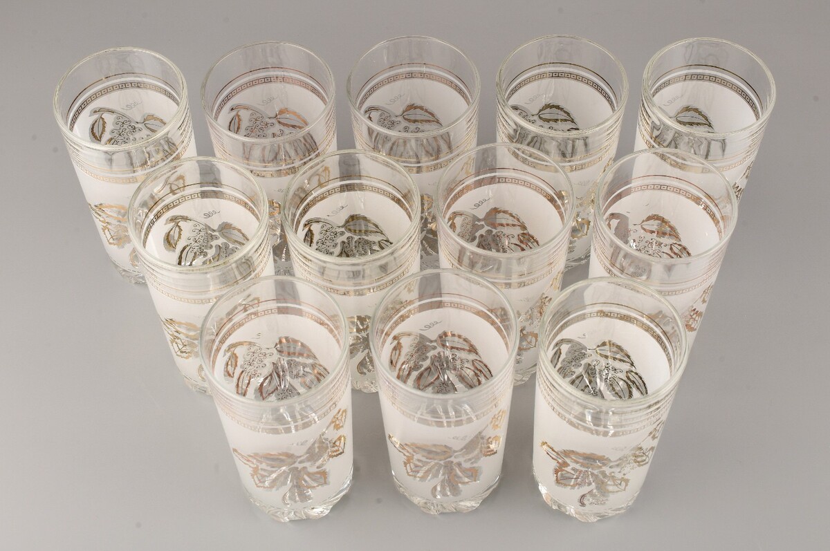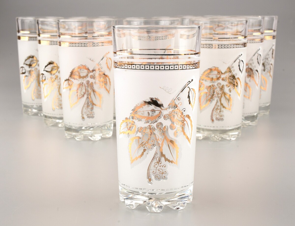 - *Set (12) Vtg Golden Foliage Frosted Gold Leaf Highball Glasses MCM Tumblers