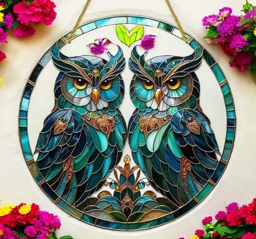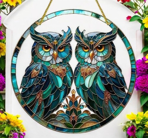 "Add a touch of elegance and nature-inspired beauty to your space with this stunning stained glass style owl artwork. Featuring two intricately designed owls with vibrant shades of blue and green, this hanging window decor captures the essence of nature?s wisdom and mystery. Perfect for brightening up any room or garden, the delicate craftsmanship and rich colors create a mesmerizing play of light. Ideal for bird lovers, stained glass enthusiasts, and those looking to add an artistic, bohemian touch to their home or outdoor setting."