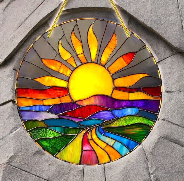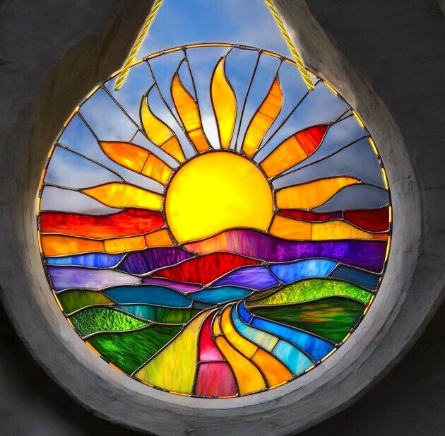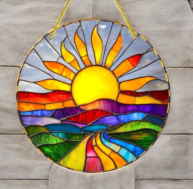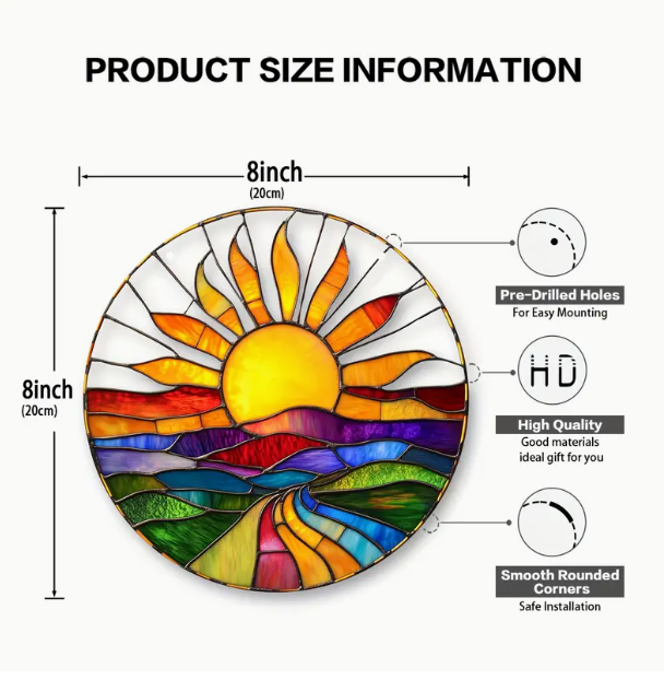 "Capture the beauty of a colorful sunset with this stunning stained glass-style acrylic suncatcher. Featuring a vibrant sun casting rays over rolling hills, this 8-inch (20 cm) round suncatcher is a perfect addition to your window, garden, or patio. Crafted with durable acrylic, it includes pre-drilled holes for easy mounting and smooth rounded edges for safe installation. A gorgeous piece of decor for nature lovers, sunset admirers, and those looking to brighten their space with radiant colors."