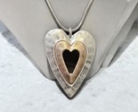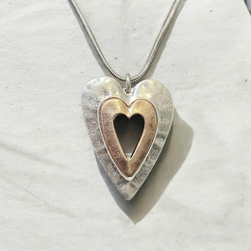 "This stunning heart-shaped pendant features a unique two-tone design with a layered silver and rose gold finish. The open-heart cutout adds a modern and romantic touch, making it a perfect gift for a loved one or a sophisticated addition to your jewelry collection. Suspended on a sleek silver chain, this necklace is ideal for both casual and formal occasions."