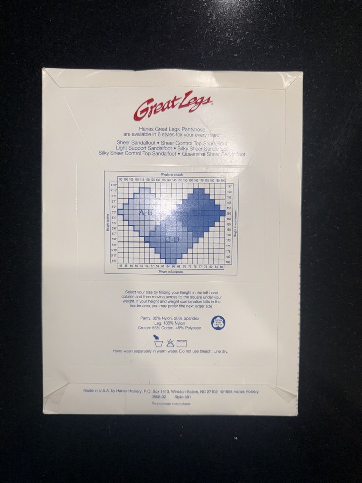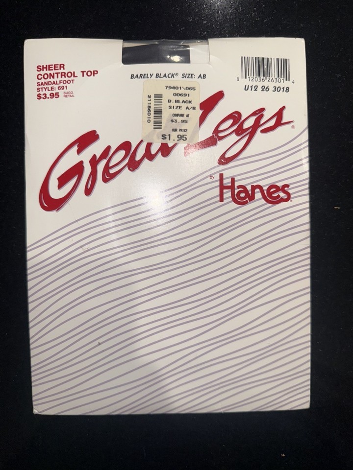 From the iconic Hanes red logo to the pre-printed MSRP of $3.95, every detail evokes a time when pantyhose were more than an accessory ? they were a daily ritual of grace, femininity, and polish. The included stockings remain neatly folded within, their original promise of smooth, flawless legs preserved in time. The stockings are sheer, control top, sandalfoot, and size AB in the shade Barely Black