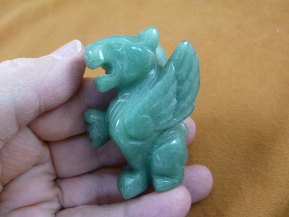 (internal #Y-LIO-GA-702) Excellent figurine of a ROARING LION GARGOYLE with wings sitting up, 2-1/4" tall. SUPERB quality of polished, natural Green aventurine gemstone, this gem has been hand-crafted in China.