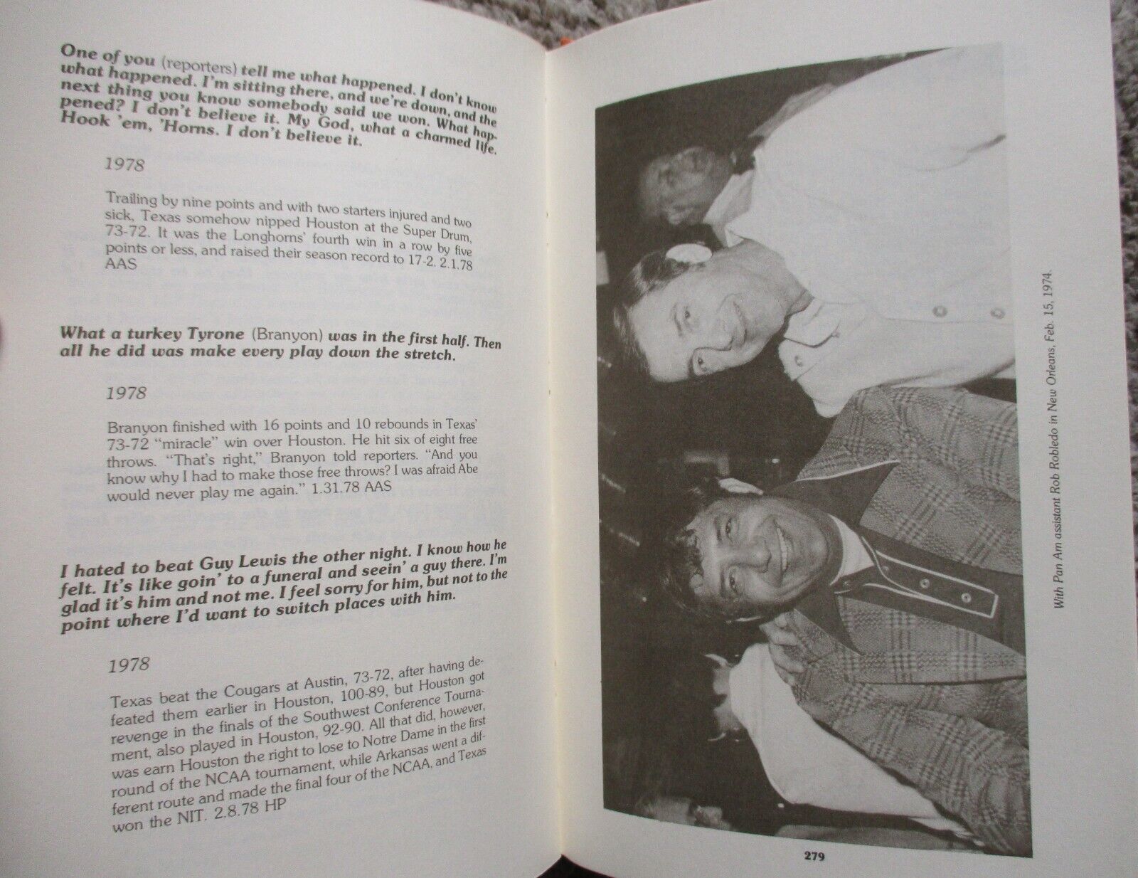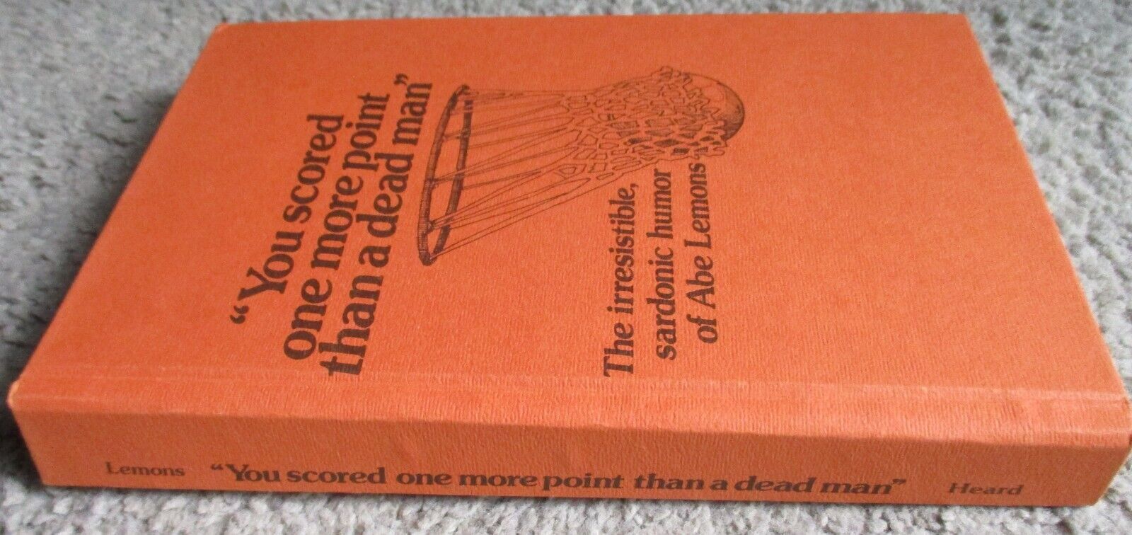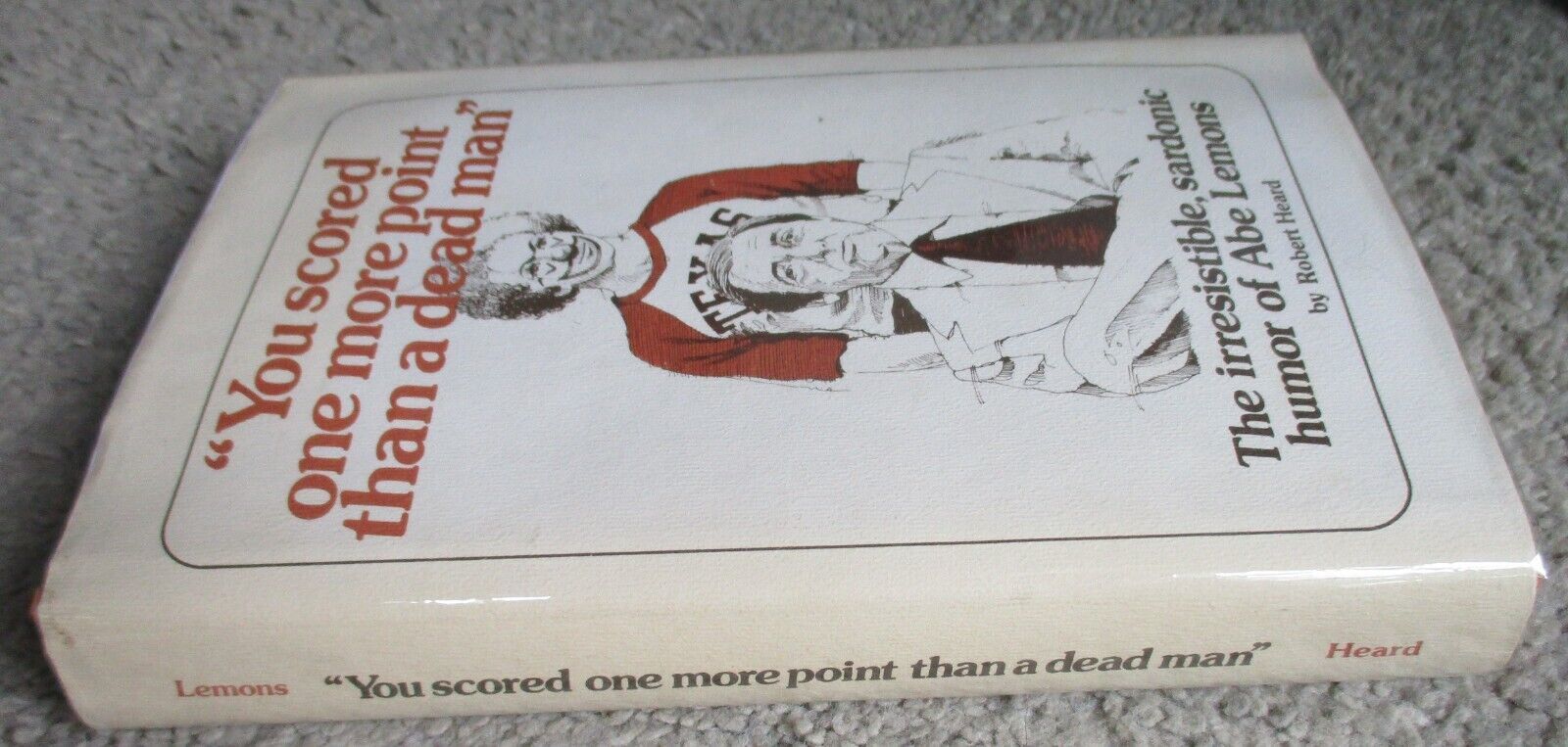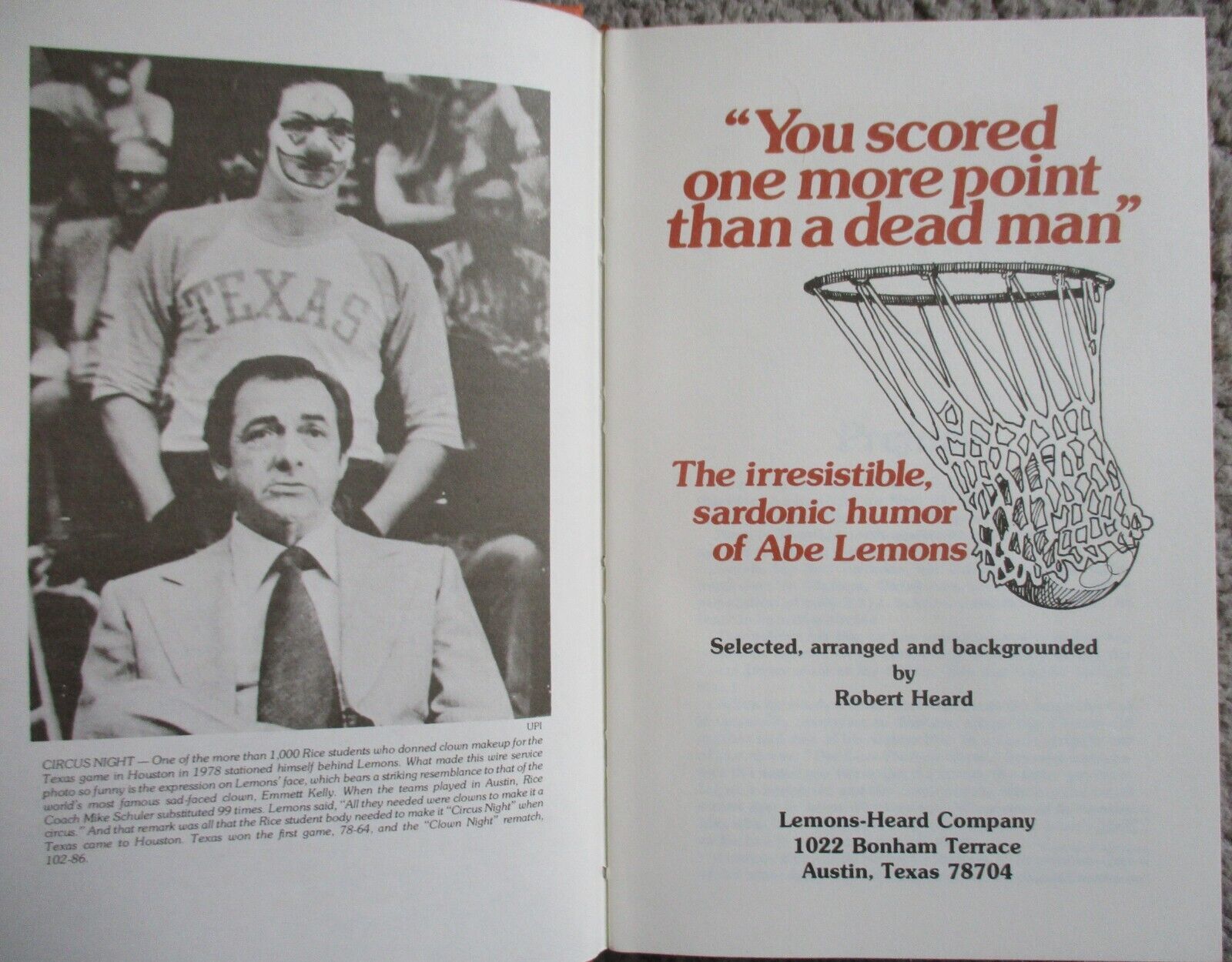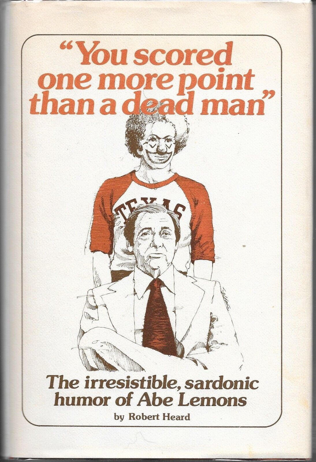 5.75" x 8.75", 312 page hardcover with dustjacket titled "YOU SCORED ONE MORE POINT THAN A DEAD MAN": THE IRRESISTIBLE, SARDONIC HUMOR OF ABE LEMONS selected, arranged and backgrounded by Robert Heard/ Lemons-Heard Company, First Edition (unstated), Copyright 1978/ A.E. "Abe" Lemons (November 21, 1922 ? September 2, 2002) was an American college basketball player and coach. As a head coach at Oklahoma City University, Pan American University and the University of Texas at Austin, he compiled a record of 594?343 in 34 seasons. He certainly wasn't afraid to criticize players, something rare in today's era of sensitivity training and pronouncements of love for "team families." Perhaps Lemons' most famous line was one he said he told a player who had scored but a single point by halftime. "You scored one more point than a dead man," Lemons proclaimed, giving birth to the title of a book of Abe's quotes that was subtitled "the irresistible, sardonic humor of Abe Lemons" edited by the late Longhorn-friendly writer, Robert Heard.