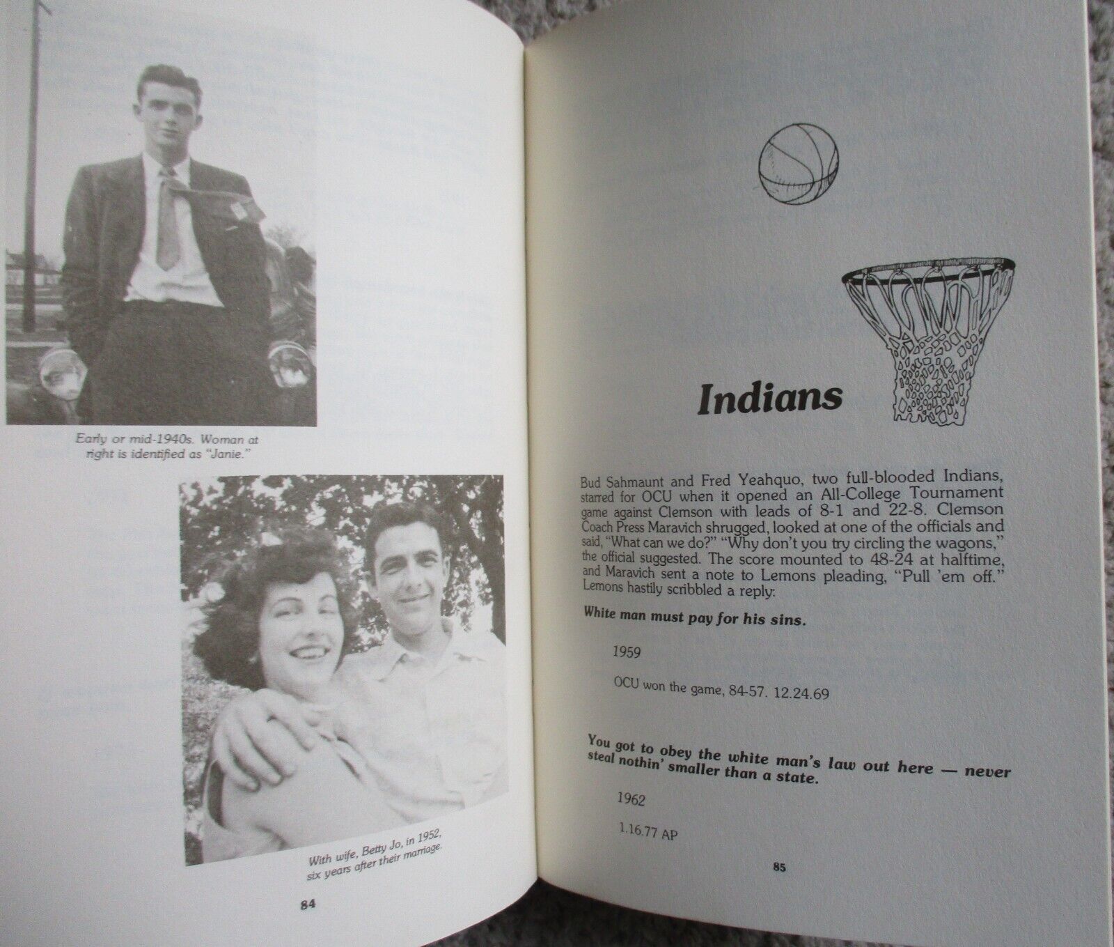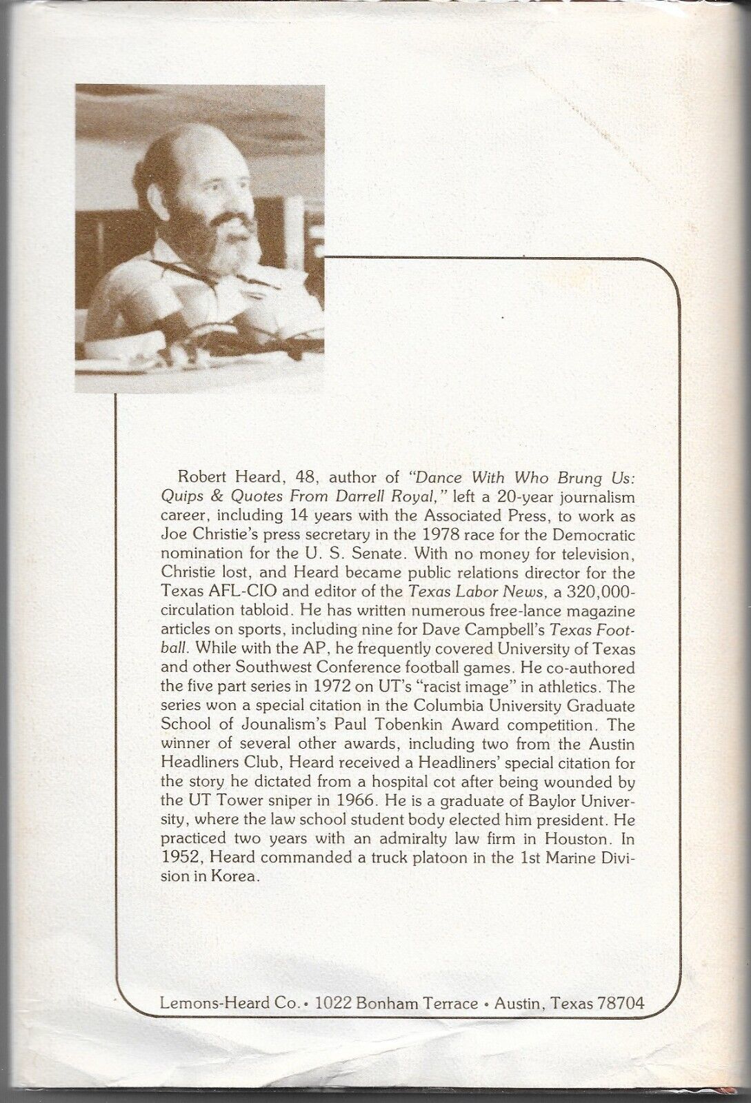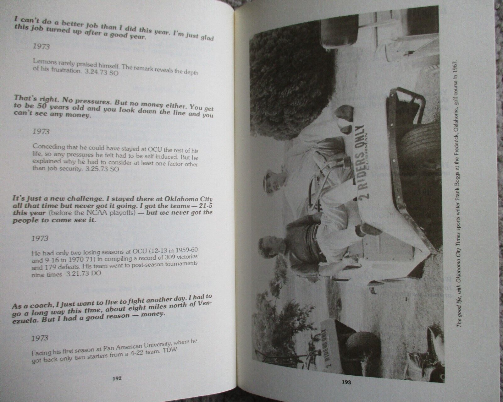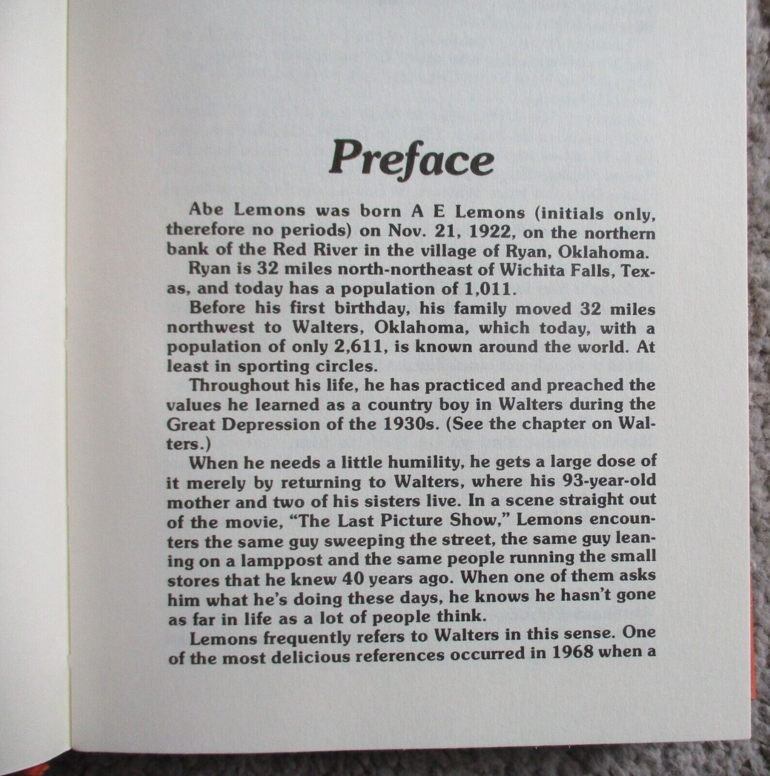 5.75" x 8.75", 312 page hardcover with dustjacket titled "YOU SCORED ONE MORE POINT THAN A DEAD MAN": THE IRRESISTIBLE, SARDONIC HUMOR OF ABE LEMONS selected, arranged and backgrounded by Robert Heard/ Lemons-Heard Company, First Edition (unstated), Copyright 1978/ A.E. "Abe" Lemons (November 21, 1922 ? September 2, 2002) was an American college basketball player and coach. As a head coach at Oklahoma City University, Pan American University and the University of Texas at Austin, he compiled a record of 594?343 in 34 seasons. He certainly wasn't afraid to criticize players, something rare in today's era of sensitivity training and pronouncements of love for "team families." Perhaps Lemons' most famous line was one he said he told a player who had scored but a single point by halftime. "You scored one more point than a dead man," Lemons proclaimed, giving birth to the title of a book of Abe's quotes that was subtitled "the irresistible, sardonic humor of Abe Lemons" edited by the late Longhorn-friendly writer, Robert Heard.