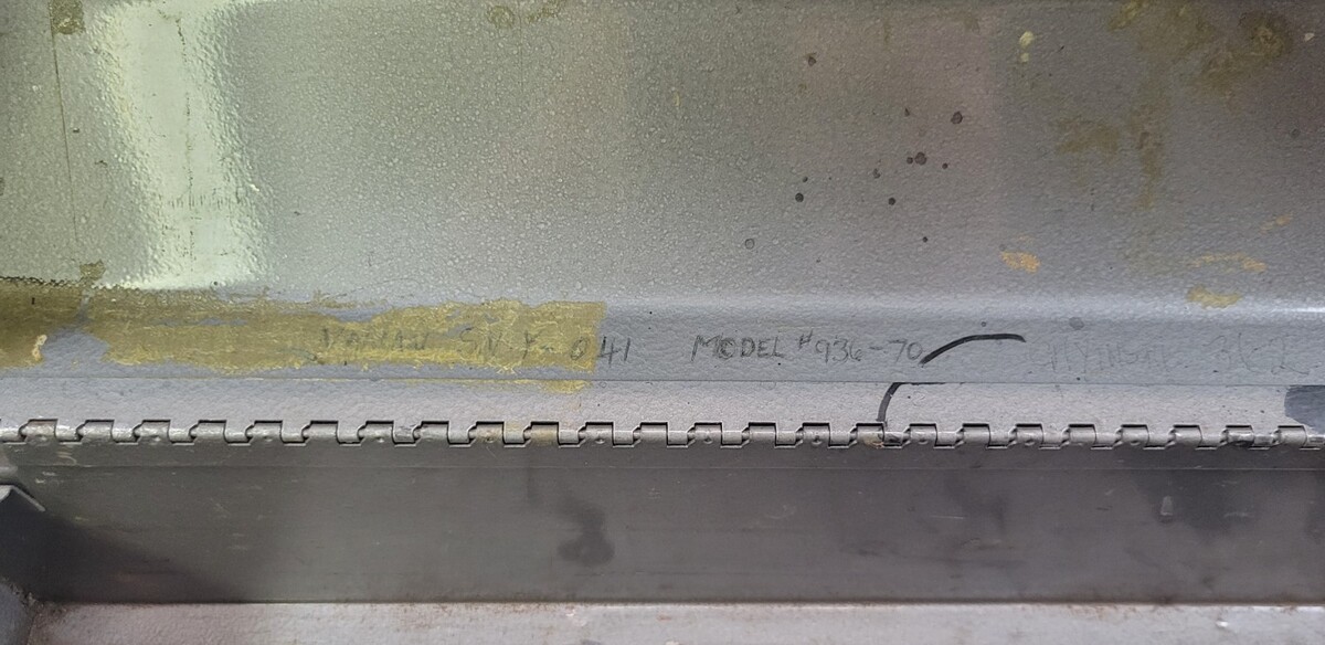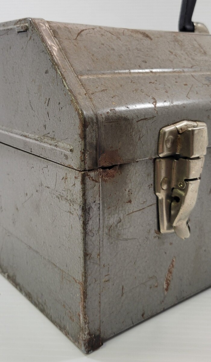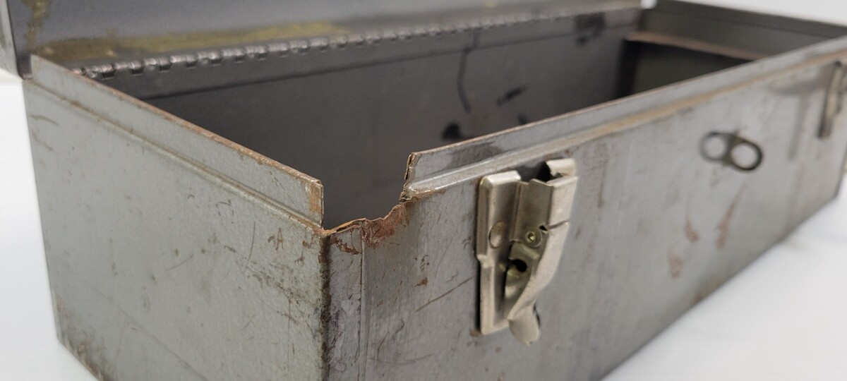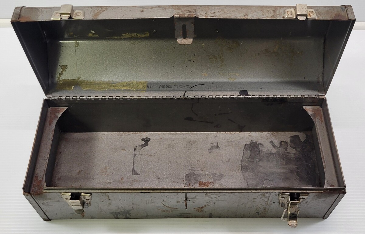 Tool box is in rough shape and more of a restoration candidate but can potentially still be used. Tool box has dings, dents, marks, scuffs, and scratches. One of the lid latches is broken. Box has been repurposed throughout the years with a slot cut to allow a wire to feed through. The original inner tray is missing and NOT included.