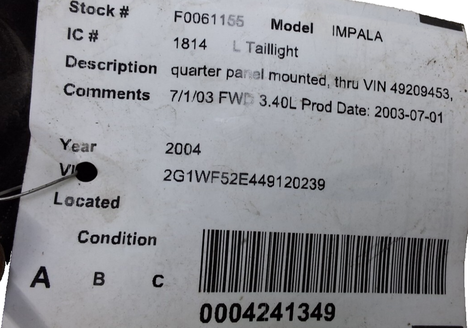 00 01 02 03 04 Chevy Impala left outer tail light assembly through VIN 49209453
