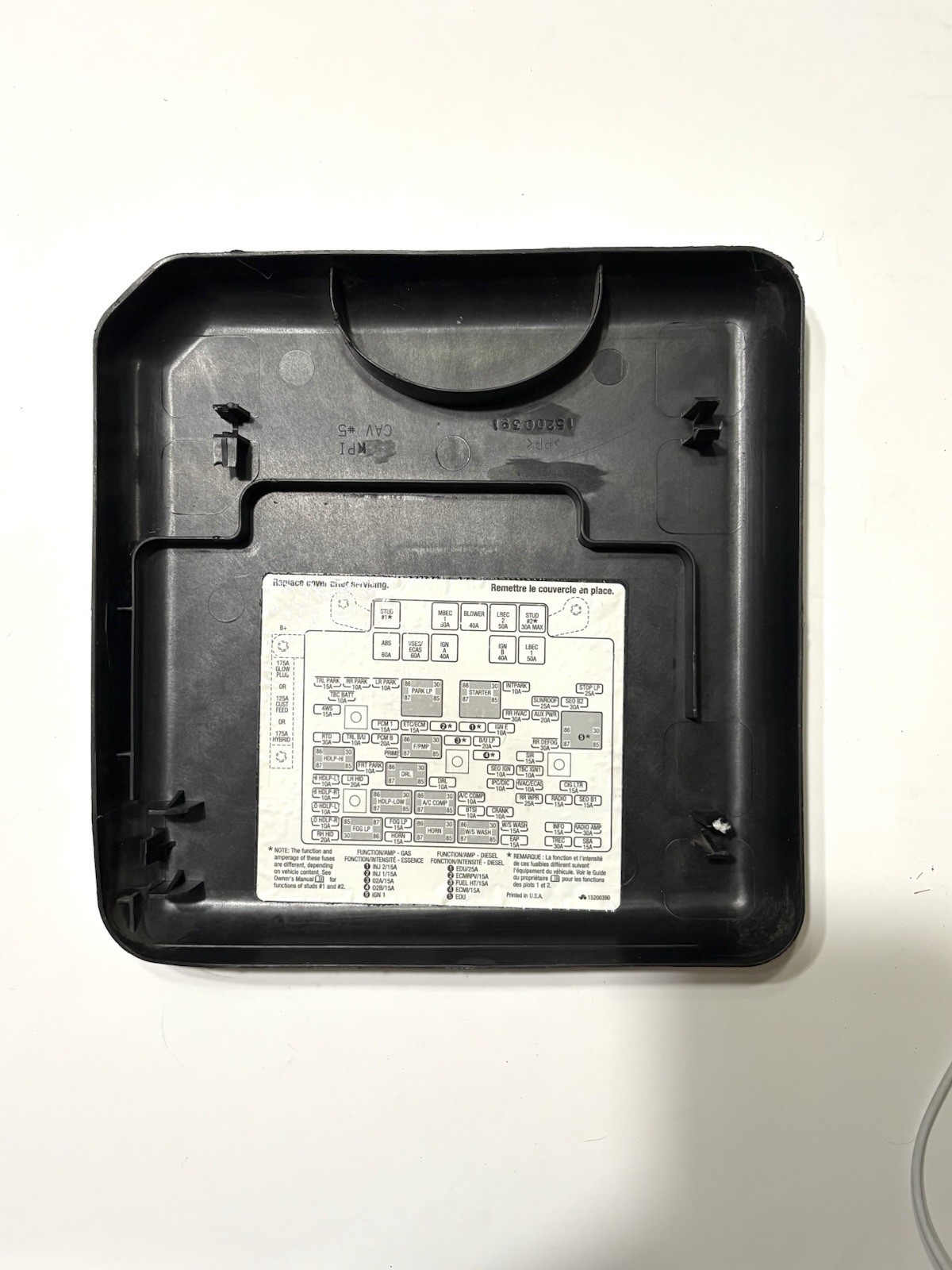 Removed from a 2004 Chevrolet Silverado 1500. This factory plastic cover protects the engine bay fuse and relay center located near the driver?s side fender.