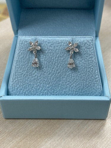 These earrings absolutely stunning for any occasion! The combination of a lab grown pear brilliant-cut center stone with lab-grown 5 pear diamonds set in 14k white gold must create a dazzling effect. Lab-grown diamonds offer not only beauty but also sustainability, which is a wonderful choice for those conscious of environmental impact. These earrings are sure to add elegance and Sparkle to any bridal ensemble!!! The total carat weight is 1.02 carats.