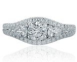 Gorgeous past, present, future engagement ring will add magic to that special moment. Set with a brilliant multitude of diamonds that follow contoured lines toward 0.56 carat round cut diamond center stone with two pear shaped side-stones, this ring is handcrafted in 14-karat white gold and completed with a high polish finish. The total carat weight is 1.30 carats.