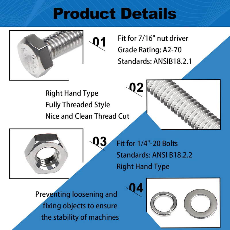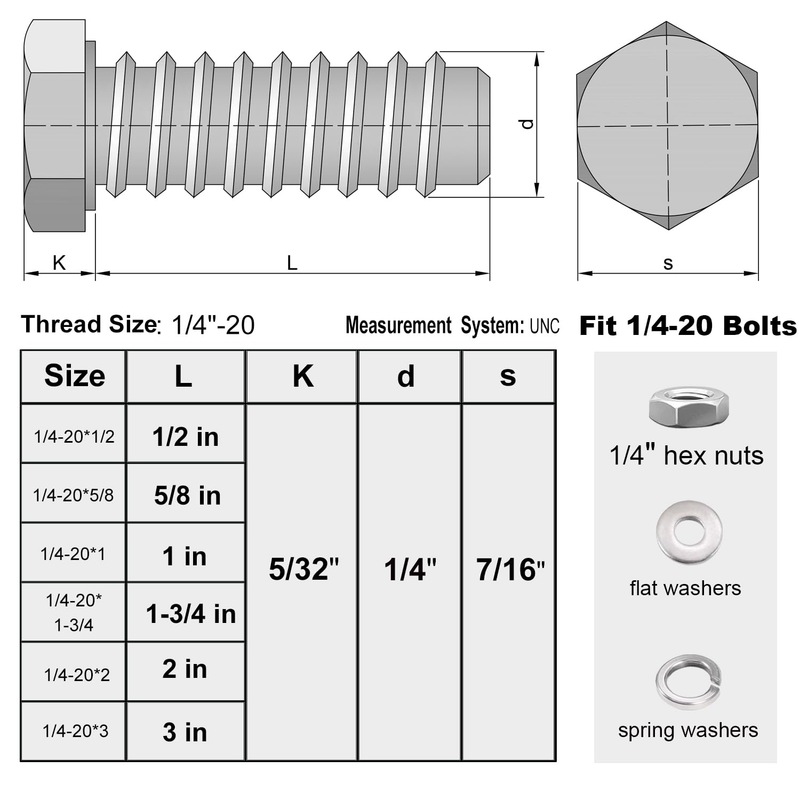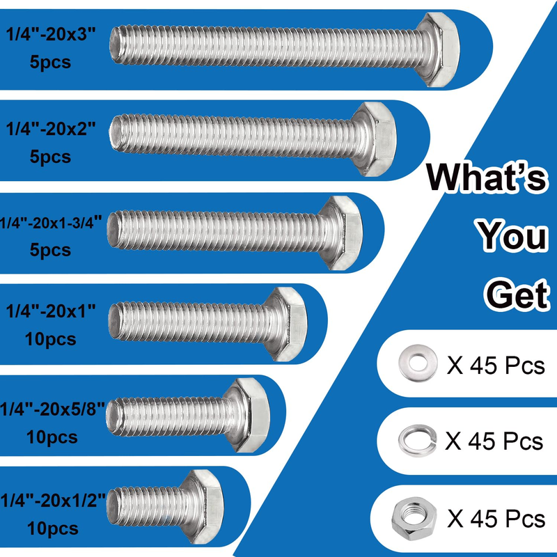 What's Included: Comes with 45 hex head bolts, 45 1/4-20 hex nuts, 45 flat washers, and 45 spring washers, providing all the components you need for secure and reliable fastening. Ideal for home repairs, automotive tasks, and more.